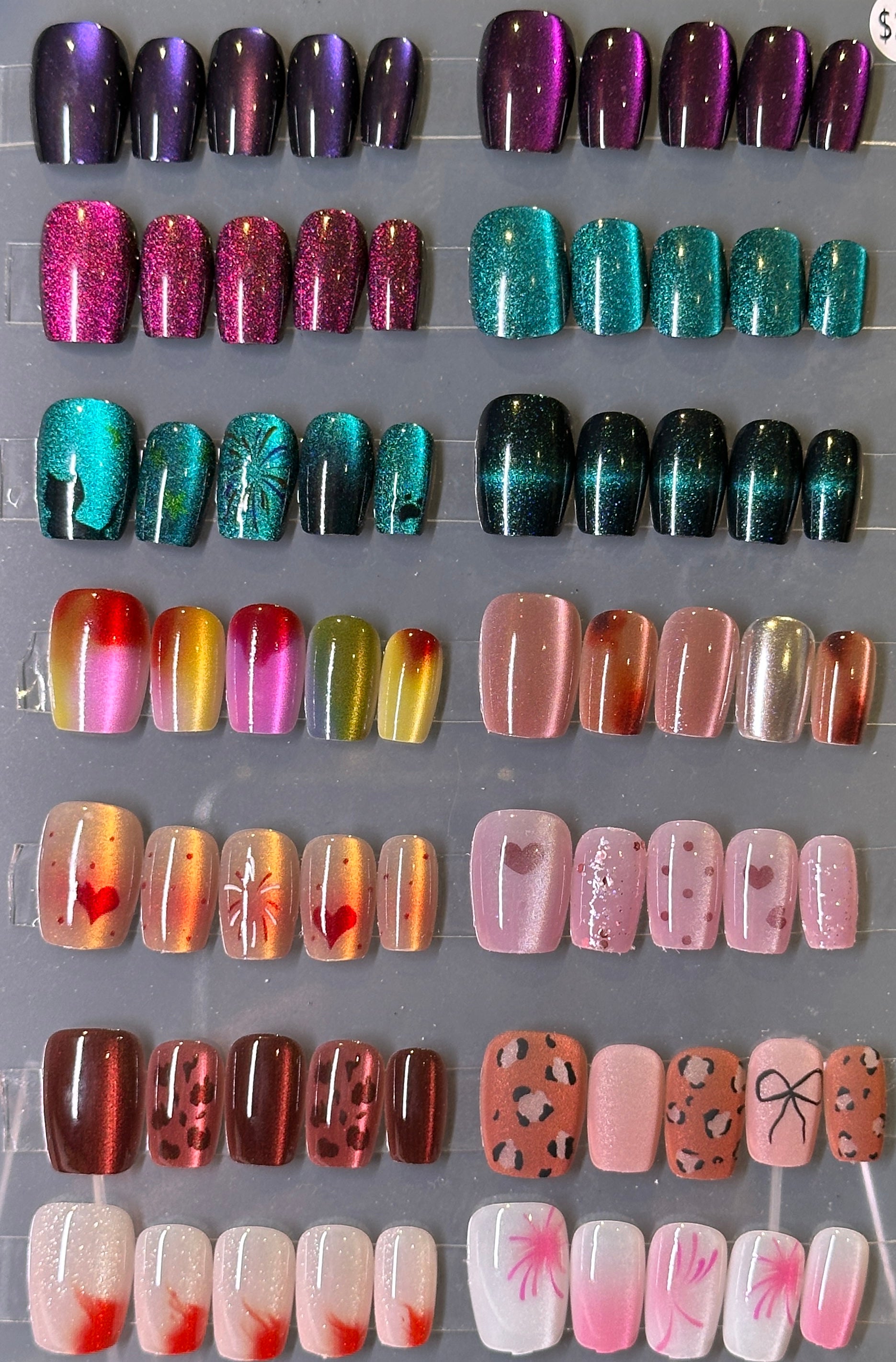 · 10 Complete Sets: You will receive 10 full sets of press-on nails (100 nails total). Each set contains 10 nails in one random style, shape, and design.