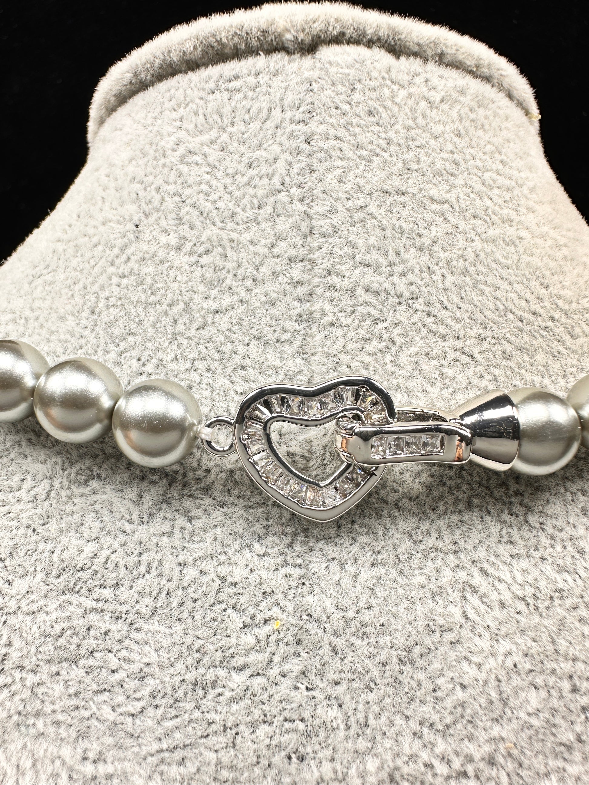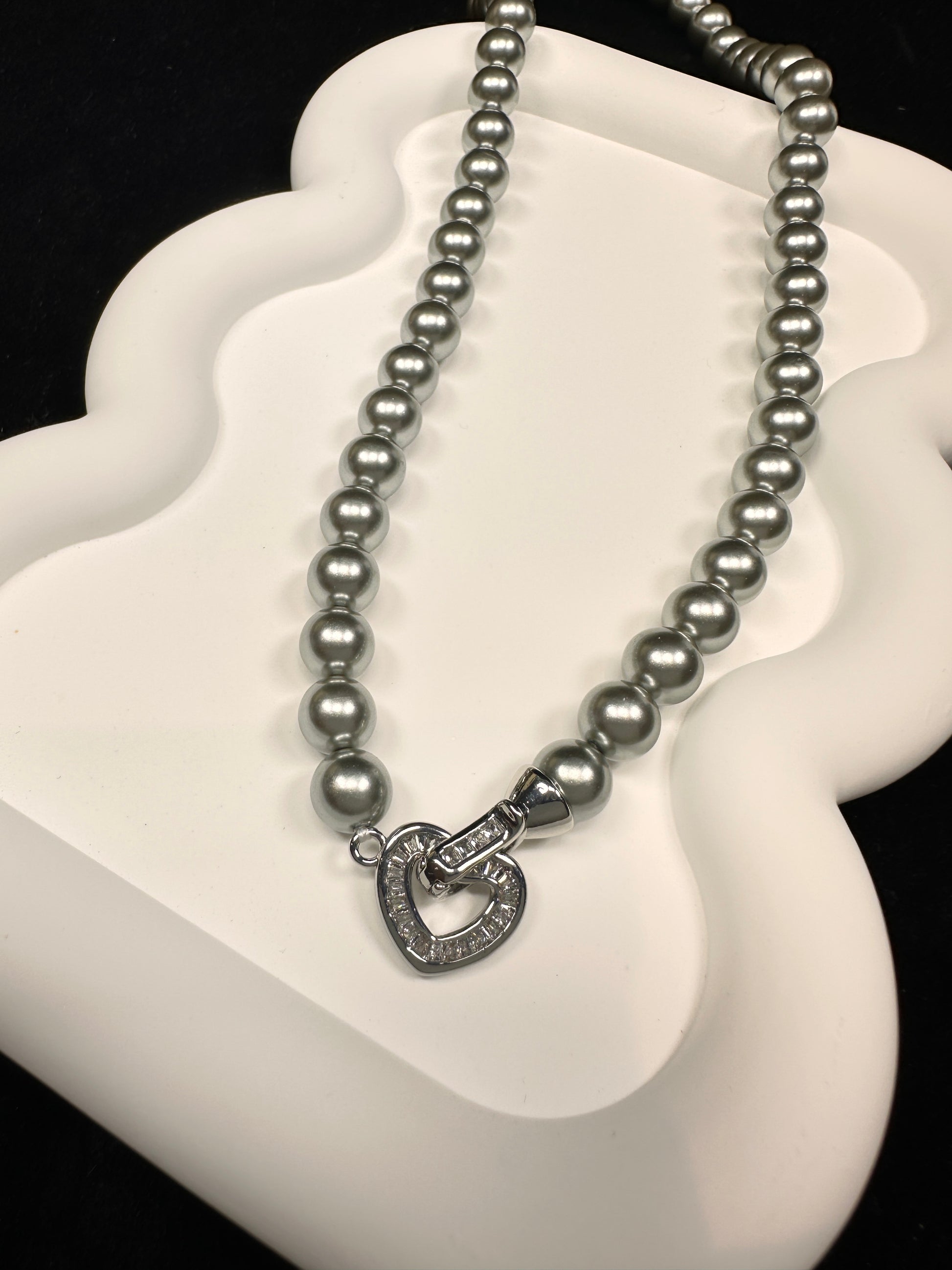 A whisper of romance in a modern shade. This necklace features a strand of elegant grey simulated pearls, whose soft matte finish serves as the perfect canvas for its delicate focal point: a heart-shaped convertible clasp, set with a shimmering transparent stone. Designed with intention, the heart can be worn prominently at the front as a sweet declaration, or discreetly at the back as your own personal signature. It’s a piece that holds a secret, inviting you to choose where to place your heart—quite literally.