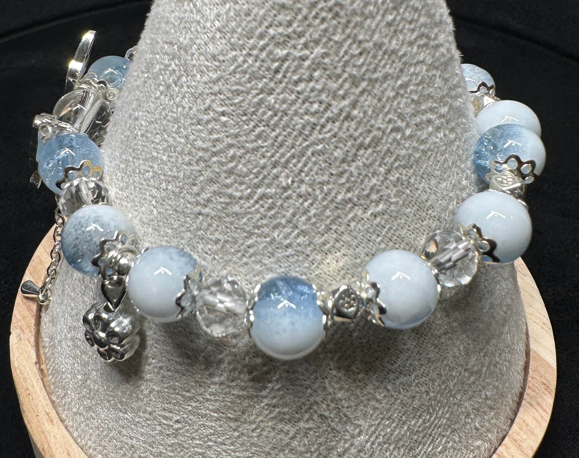 Experience the essence of graceful transformation with our Aerial Bloom bracelet. This delicate piece combines the serene colors of sky blue, pure white, and clear glass beads to create a look that is both fresh and ethereal.