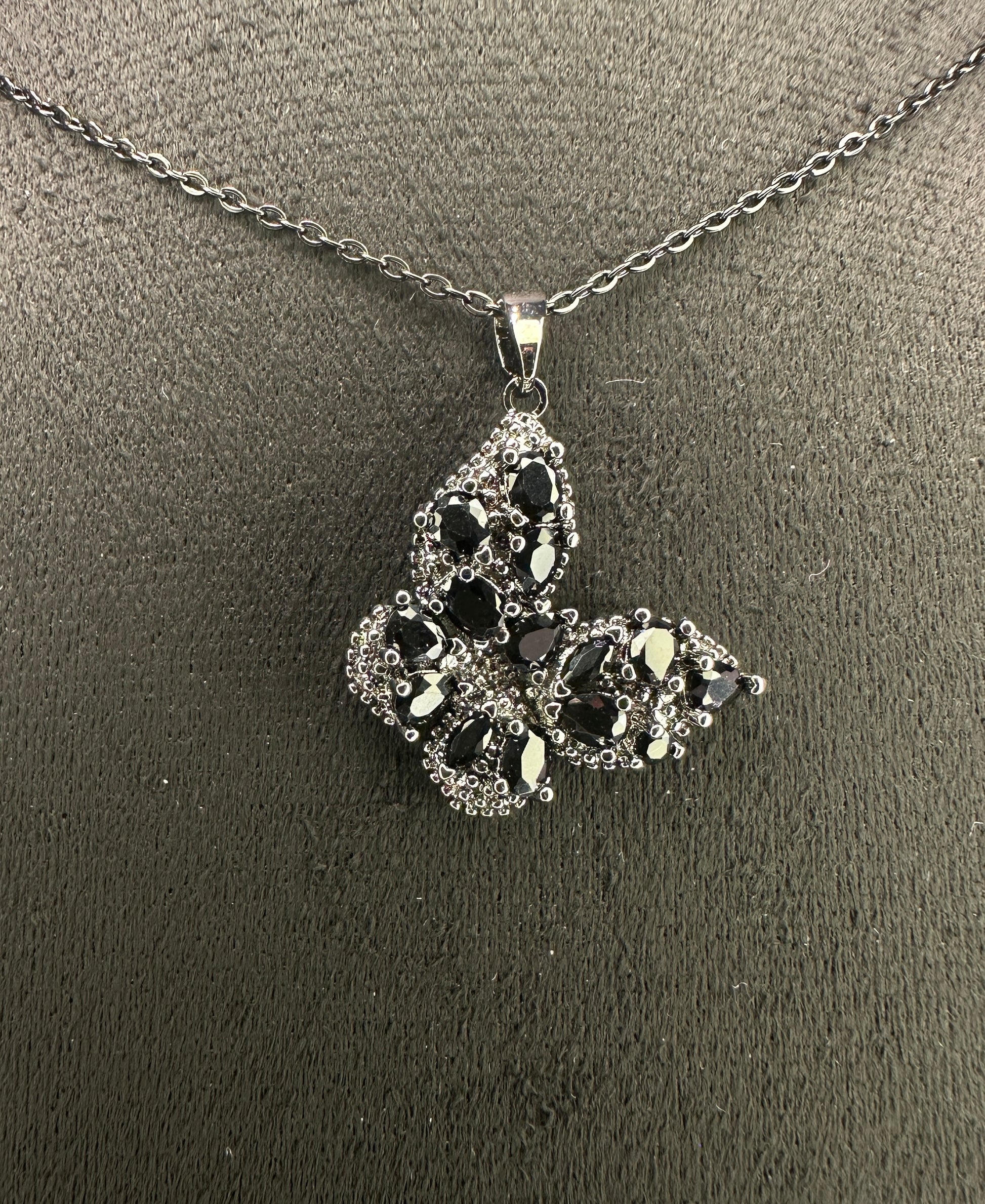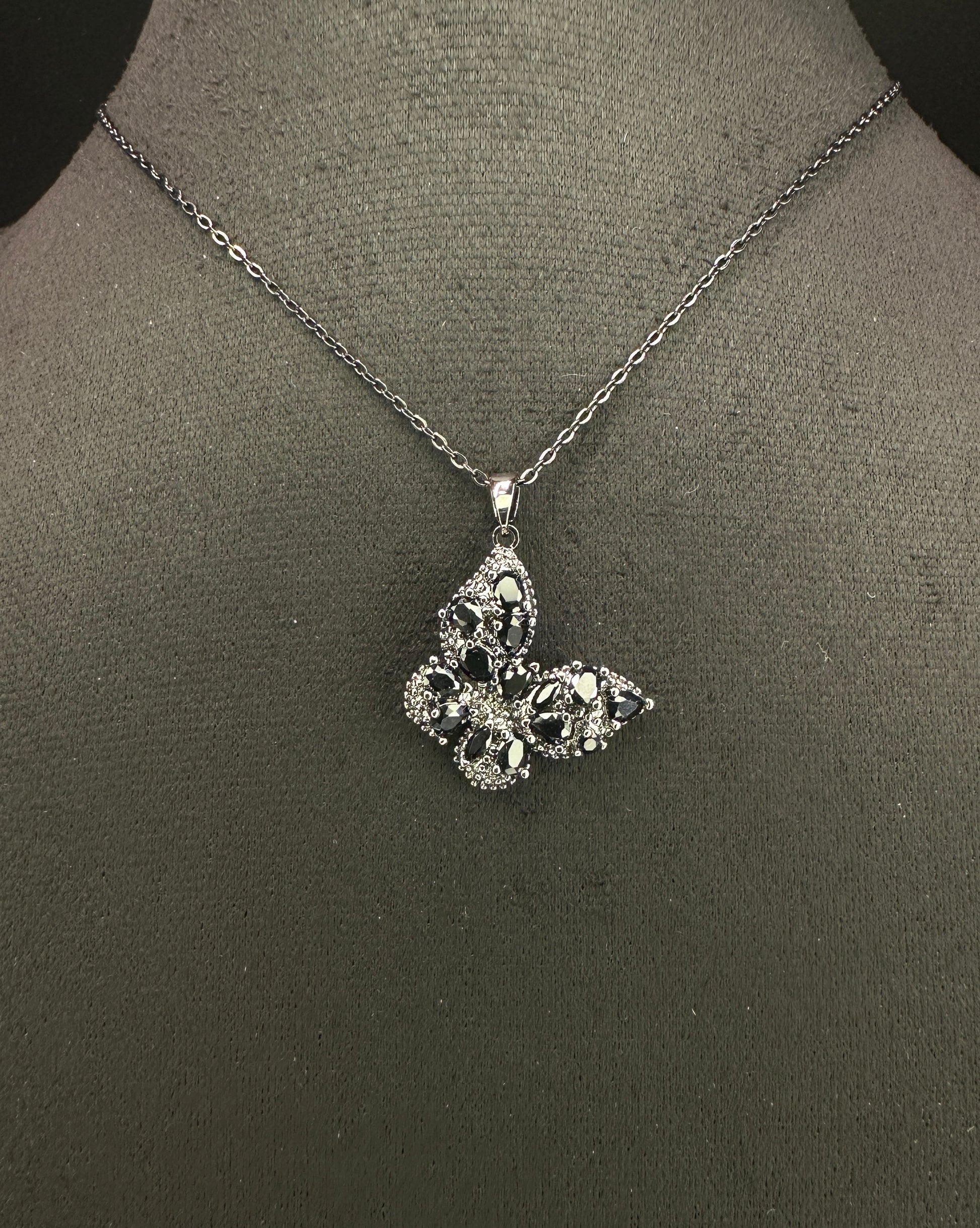 The Sable Aura Wing Pendant redefines elegance with a modern, dramatic edge. This piece presents a butterfly woven from darkness, its wings meticulously paved with black stones that create a deep, textured allure. The black-toned metal setting merges seamlessly with the stones, presenting a powerful and unified silhouette. It is a statement of sophisticated individuality for those who dance in the twilight.