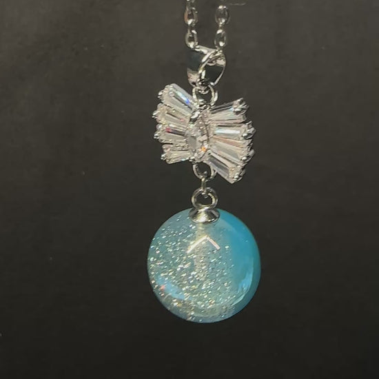 Embrace cosmic elegance with our Celestial Bow pendant. Featuring a sophisticated bow design with marquise and trapezoid stones, flowing into a vibrant blue galaxy sphere.