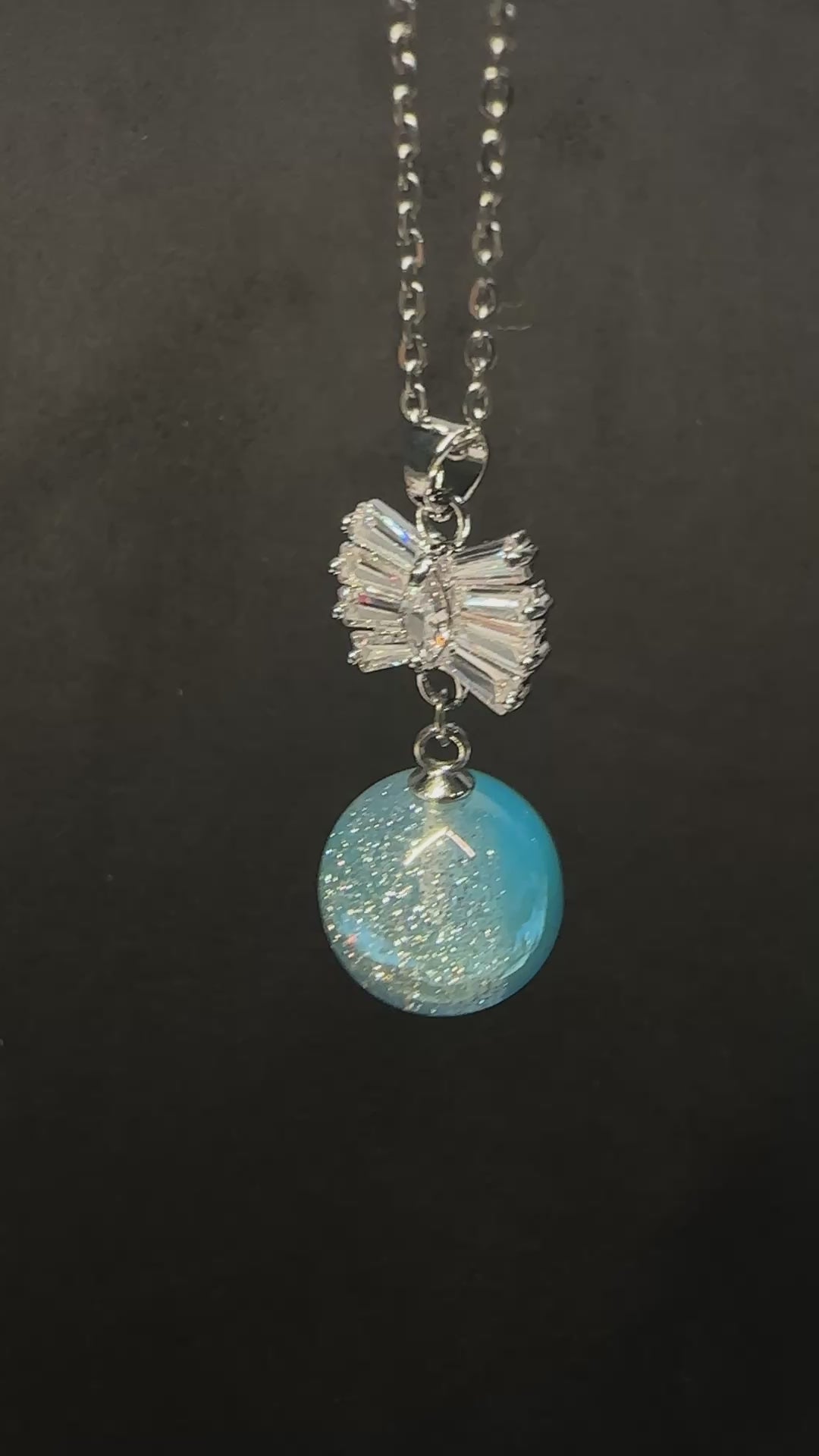 The Celestial Bow Galaxy Pendant wraps the cosmos in an exquisite package of celestial elegance. The top charm presents a sophisticated bow, meticulously crafted with a central marquise stone flanked by four trapezoid stones on each side - creating a structured yet fluid silhouette that mimics the graceful trails of shooting stars. This celestial ribbon flows seamlessly into a vibrant blue galaxy sphere, where a miniature universe of swirling blues and silvers awaits. Perfect for those who believe the universe delivers its gifts with impeccable style.