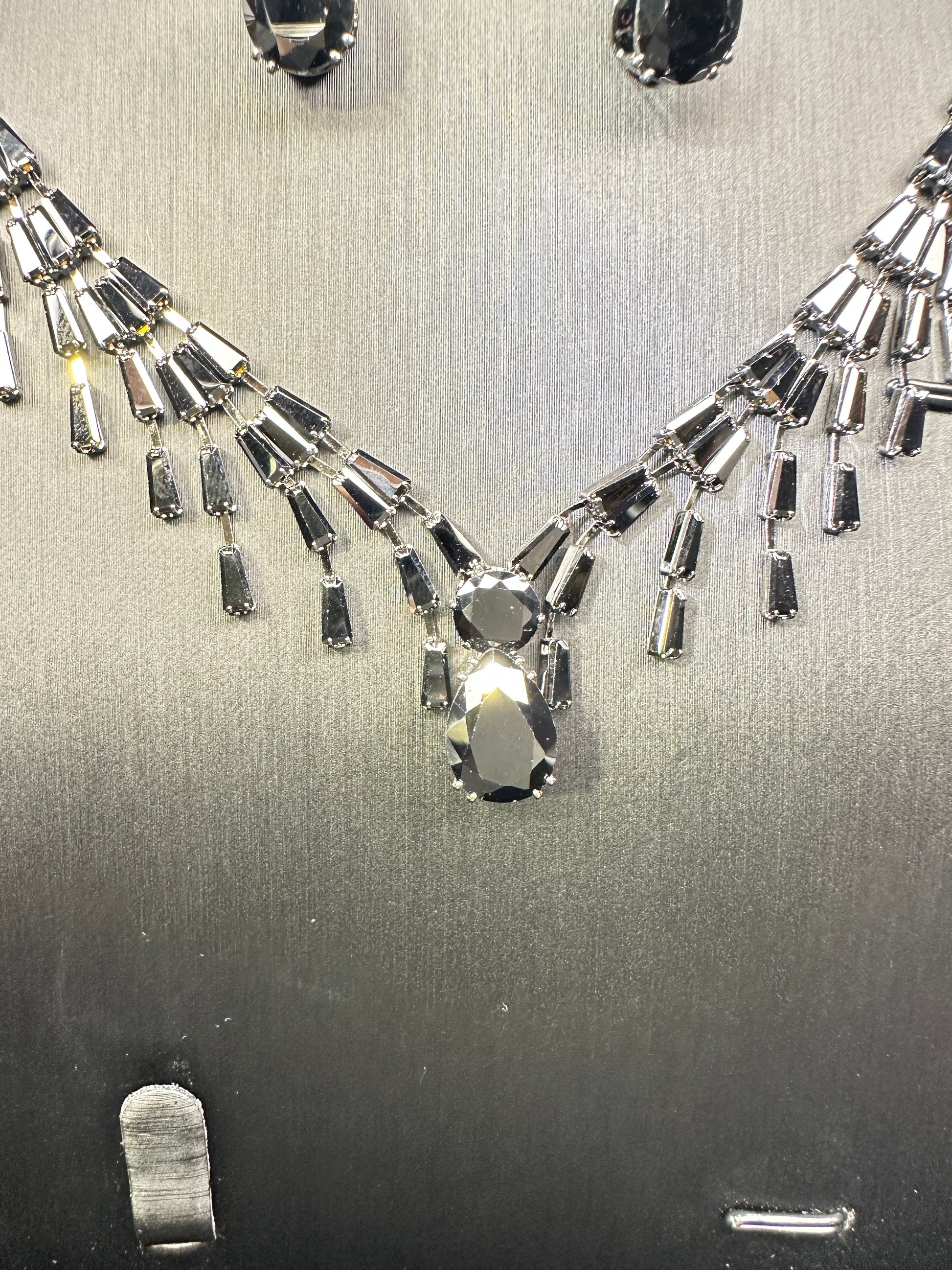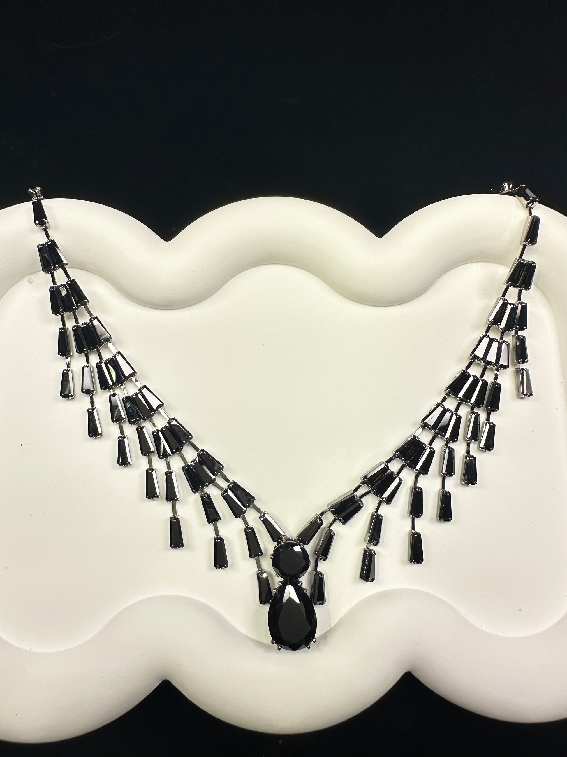 Deep black, like a tranquil night sky. The stacked geometric trapezoids resemble a city silhouette under the dusk, serene and mysterious. Accented with pear-cut stones like streaking starlight, it's a timeless choice that embodies strength and elegance.