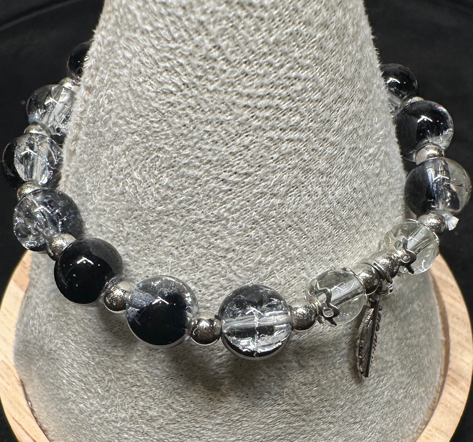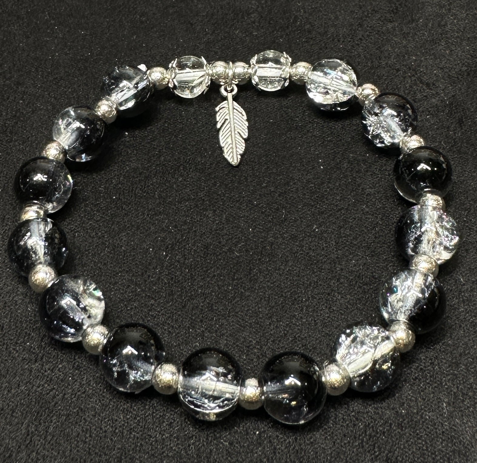 The Midnight Whisper Bracelet is a dialogue between depth and lightness. It captures the profound calm of a moonless night with its sleek black glass beads, contrasted by the pure clarity of transparent glass, as if starlight is breaking through the darkness. A single, delicate feather guides this balance, symbolizing the gentle voice of intuition that speaks in quiet moments.