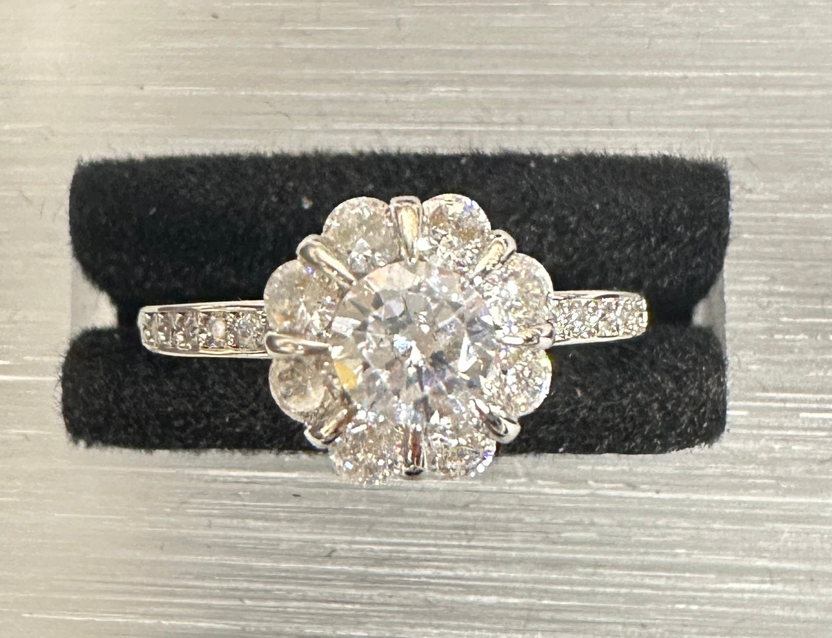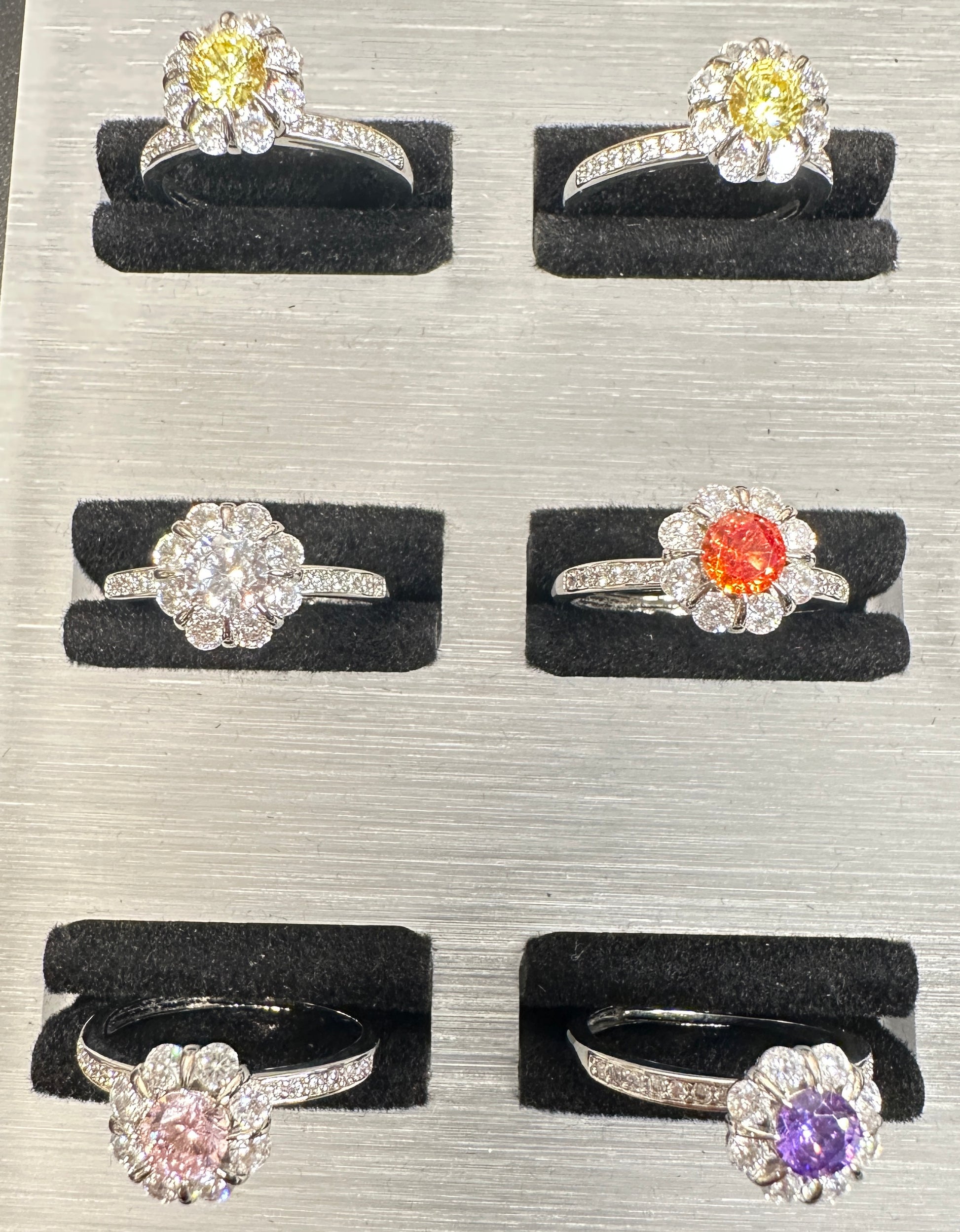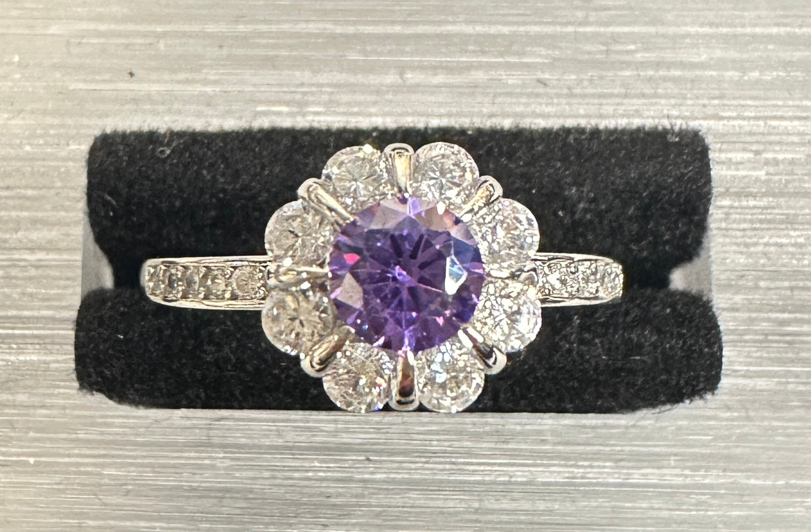 The Daisy Bloom Adjustable Ring Collection captures the cheerful spirit of its namesake flower in a band of cool-toned metal. This design centers on a smaller, delicate centerstone, which acts as the heart of the flower. It is surrounded by a halo of slightly larger white stones, artfully arranged to create the appearance of soft, circular petals.