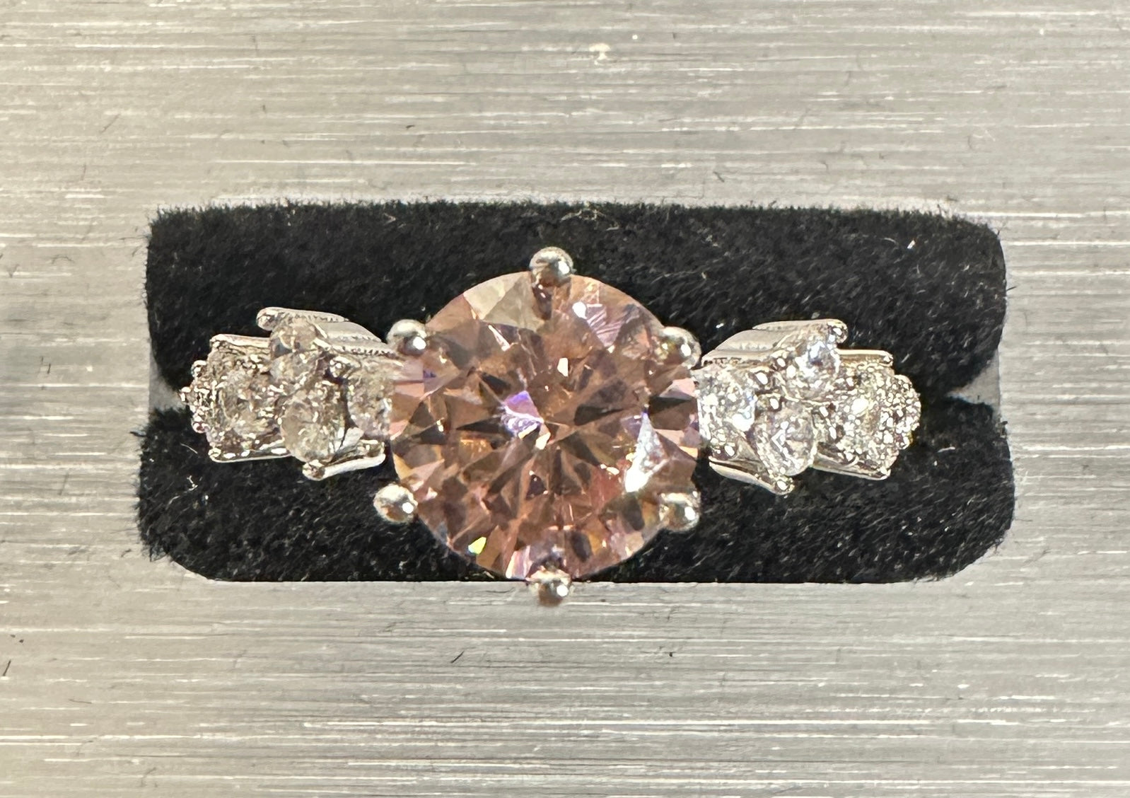 The Lily Classic Adjustable Ring Collection celebrates a timeless design, elevated for everyday wear. At its heart, a luminous round centerstone is held in a secure six-prong setting, a classic choice that maximizes the stone's exposure to light for exceptional brilliance. The elegance extends along the band, where several round white stones are set on each side, adding a delicate, sparkling frame to the central gem.