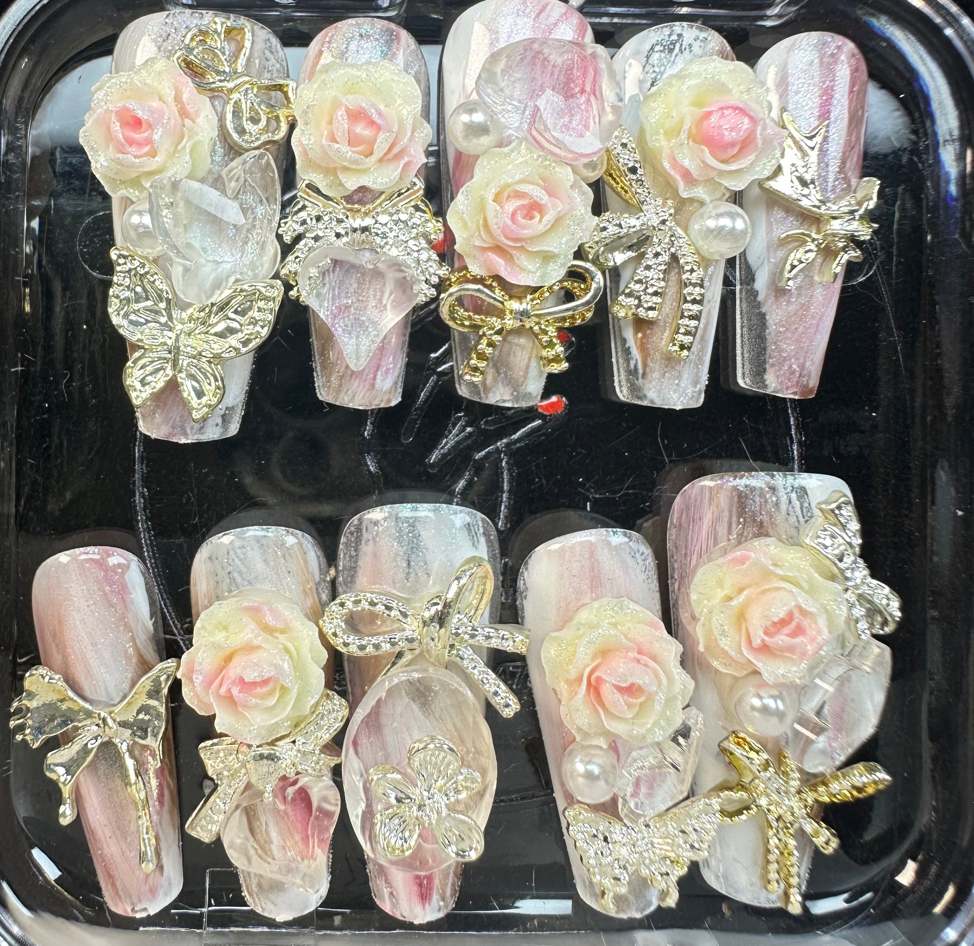 The Blossom & Glamour Collection – every set is a handcrafted floral masterpiece. Meticulous, multi-step artistry blooms on each nail, adorned with crystals and ornate details. Each design is one-of-a-kind, waiting for its only owner.