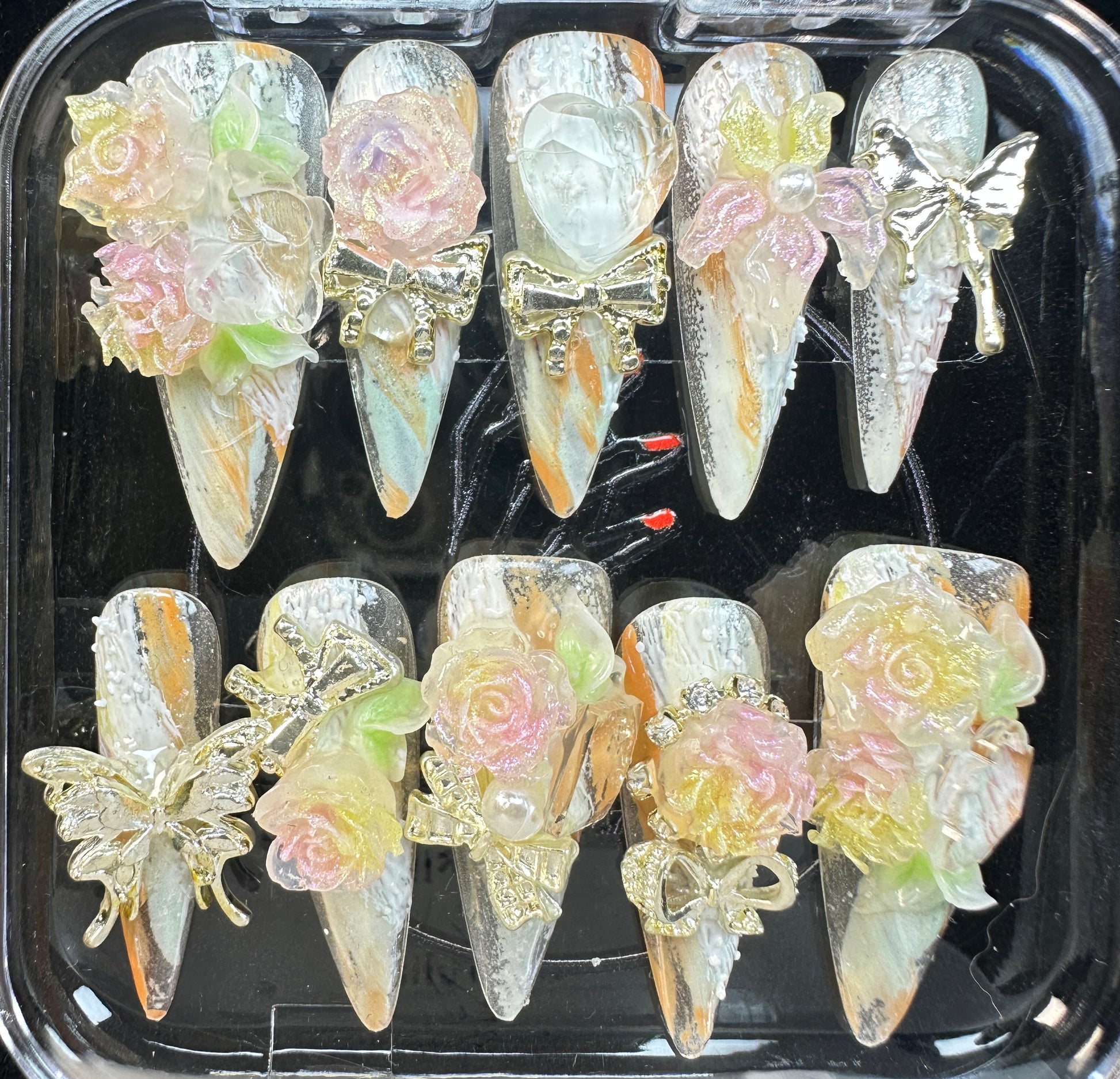 The Blossom & Glamour Collection – every set is a handcrafted floral masterpiece. Meticulous, multi-step artistry blooms on each nail, adorned with crystals and ornate details. Each design is one-of-a-kind, waiting for its only owner.