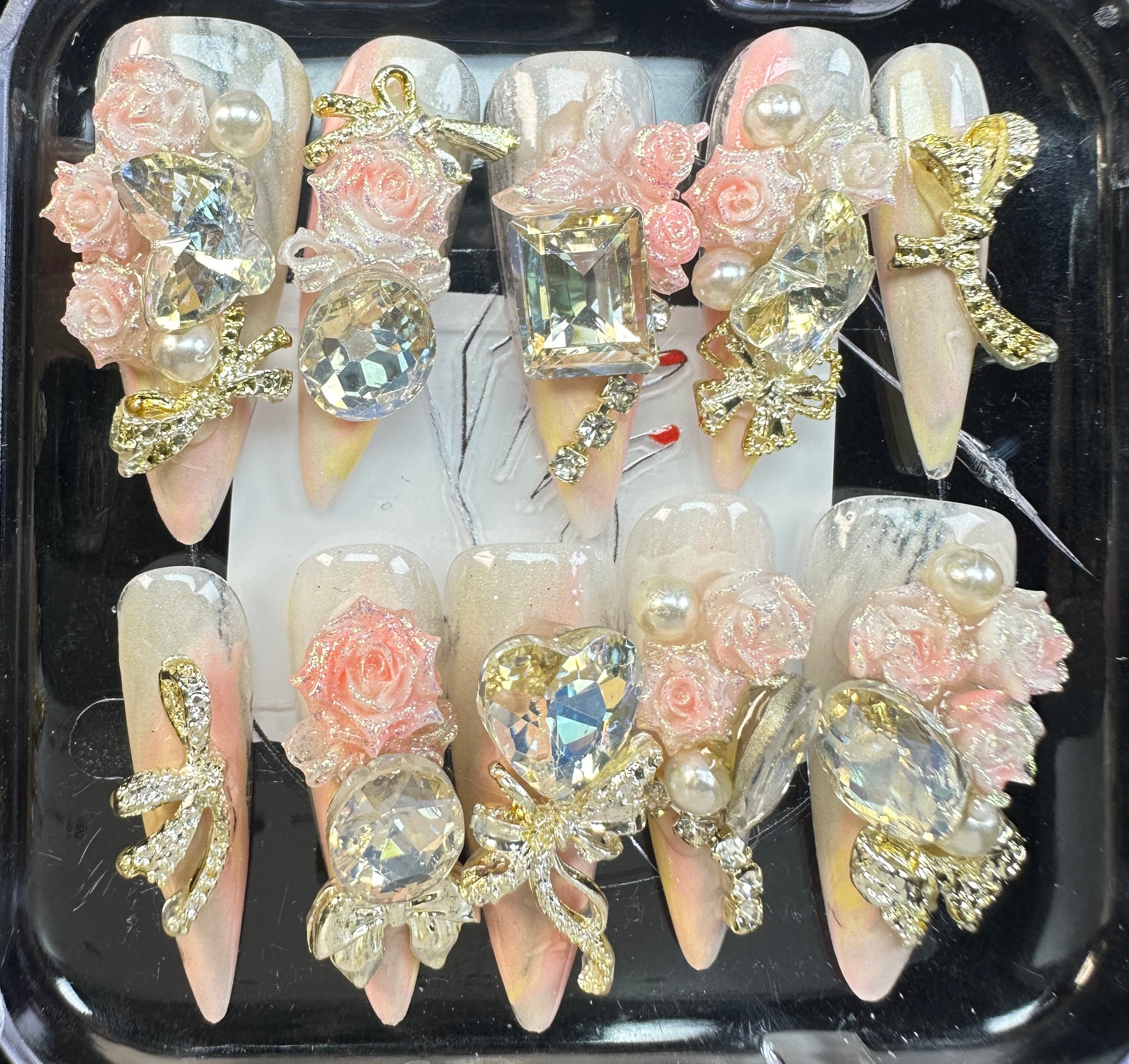 The Blossom & Glamour Collection – every set is a handcrafted floral masterpiece. Meticulous, multi-step artistry blooms on each nail, adorned with crystals and ornate details. Each design is one-of-a-kind, waiting for its only owner.