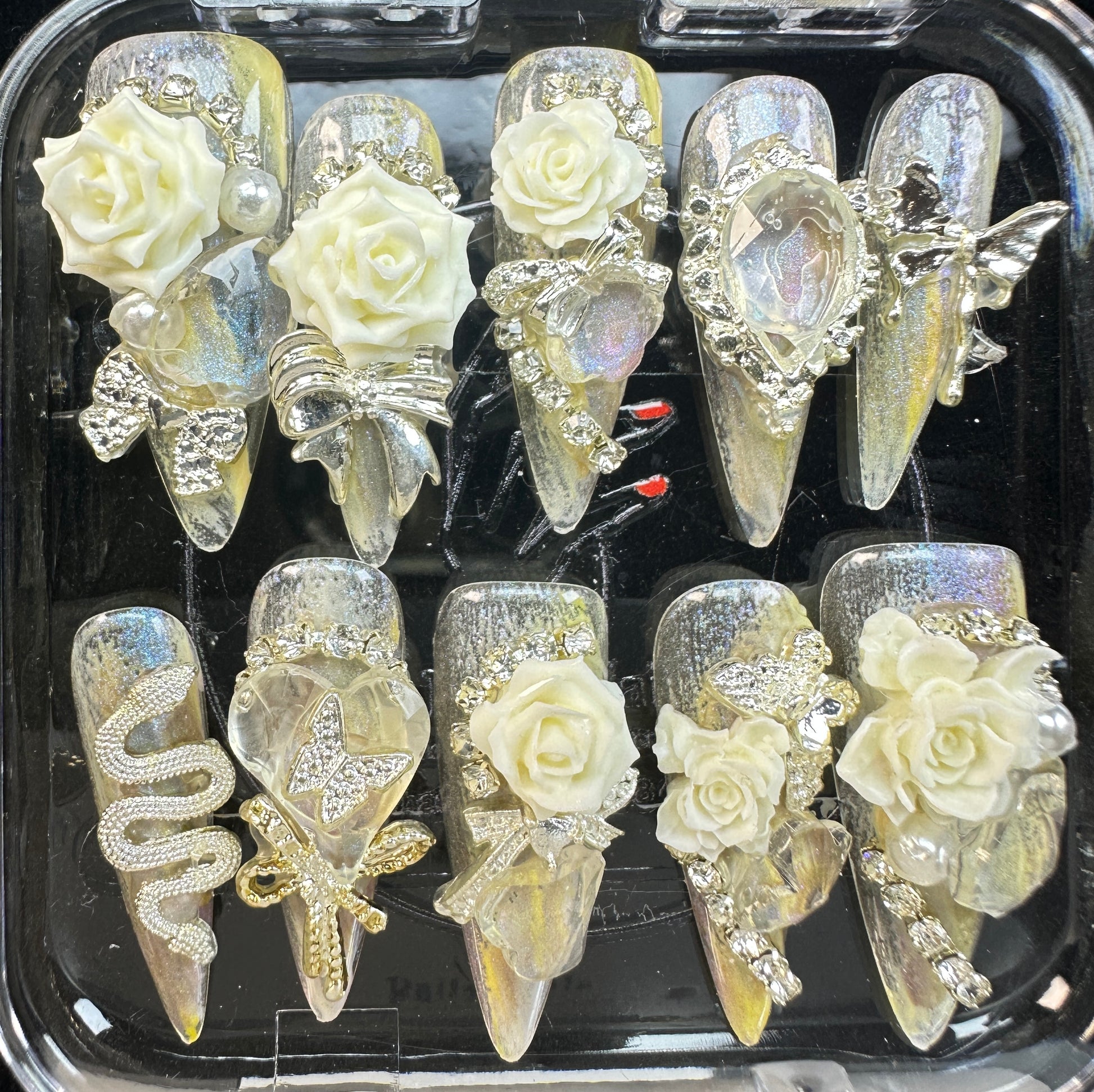 The Blossom & Glamour Collection – every set is a handcrafted floral masterpiece. Meticulous, multi-step artistry blooms on each nail, adorned with crystals and ornate details. Each design is one-of-a-kind, waiting for its only owner.