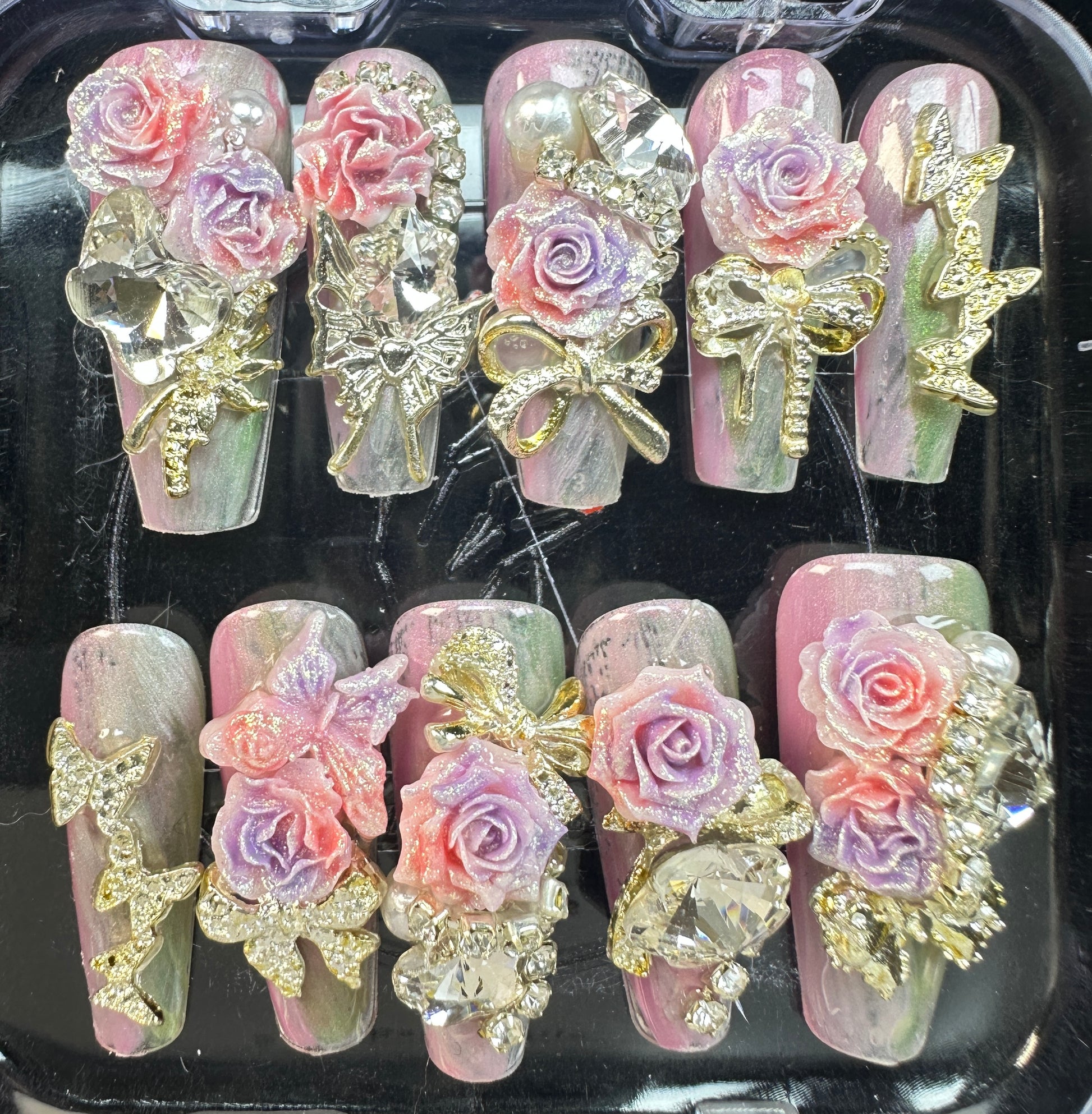 The Blossom & Glamour Collection – every set is a handcrafted floral masterpiece. Meticulous, multi-step artistry blooms on each nail, adorned with crystals and ornate details. Each design is one-of-a-kind, waiting for its only owner.