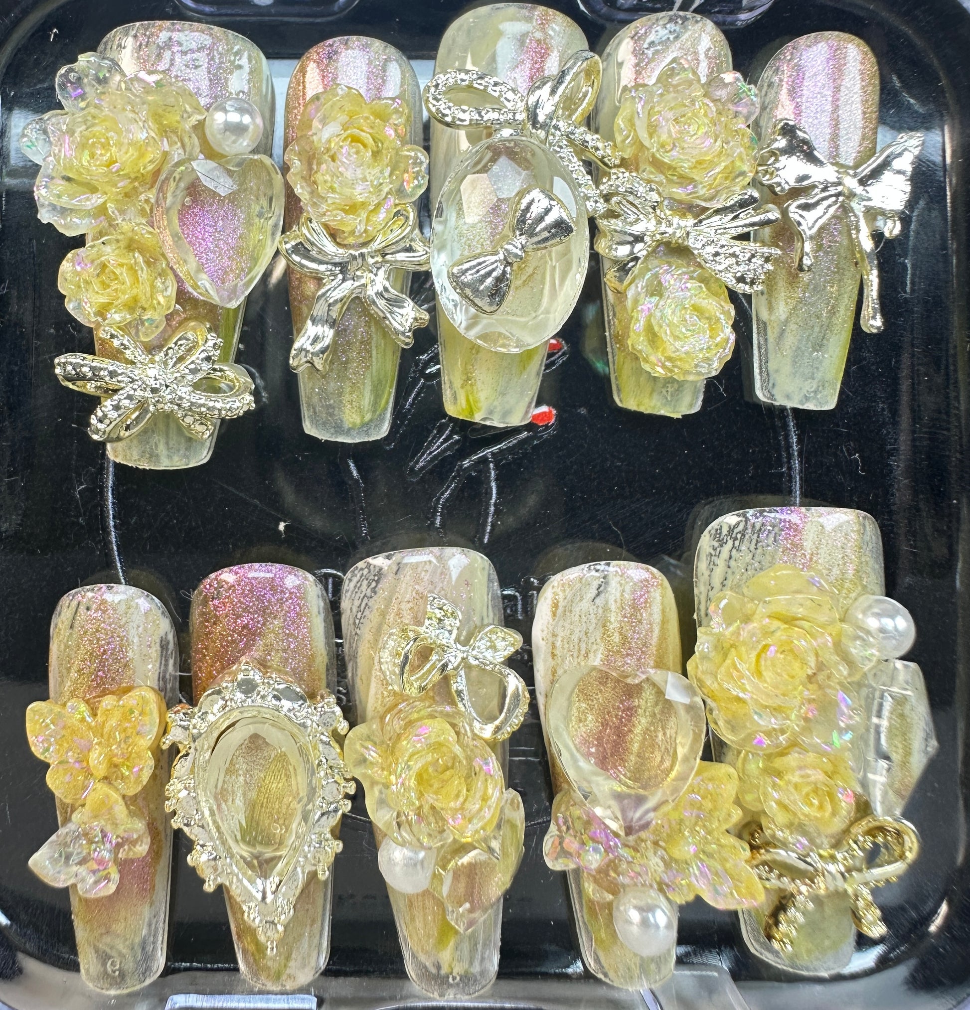 The Blossom & Glamour Collection – every set is a handcrafted floral masterpiece. Meticulous, multi-step artistry blooms on each nail, adorned with crystals and ornate details. Each design is one-of-a-kind, waiting for its only owner.