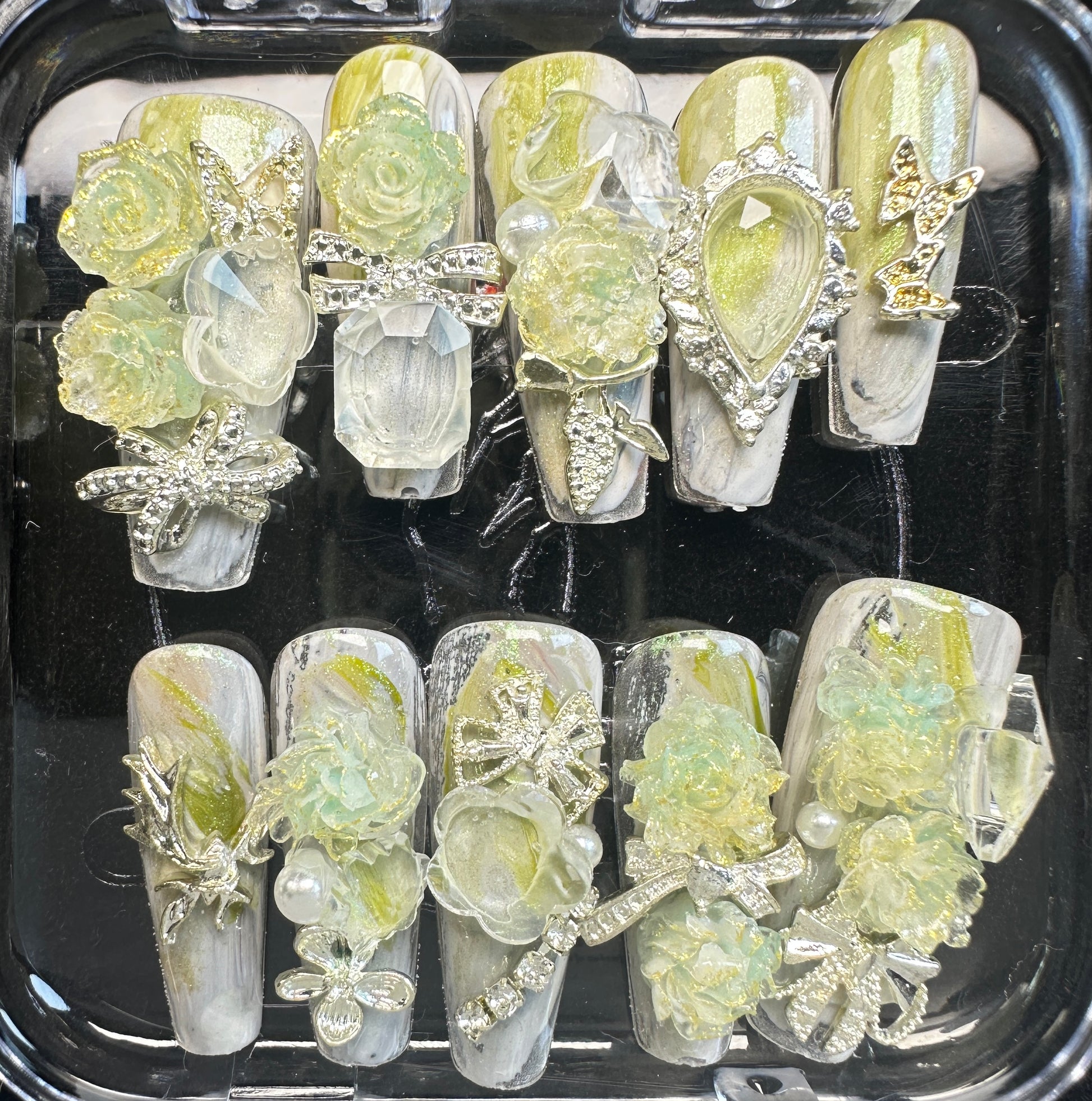 The Blossom & Glamour Collection – every set is a handcrafted floral masterpiece. Meticulous, multi-step artistry blooms on each nail, adorned with crystals and ornate details. Each design is one-of-a-kind, waiting for its only owner.