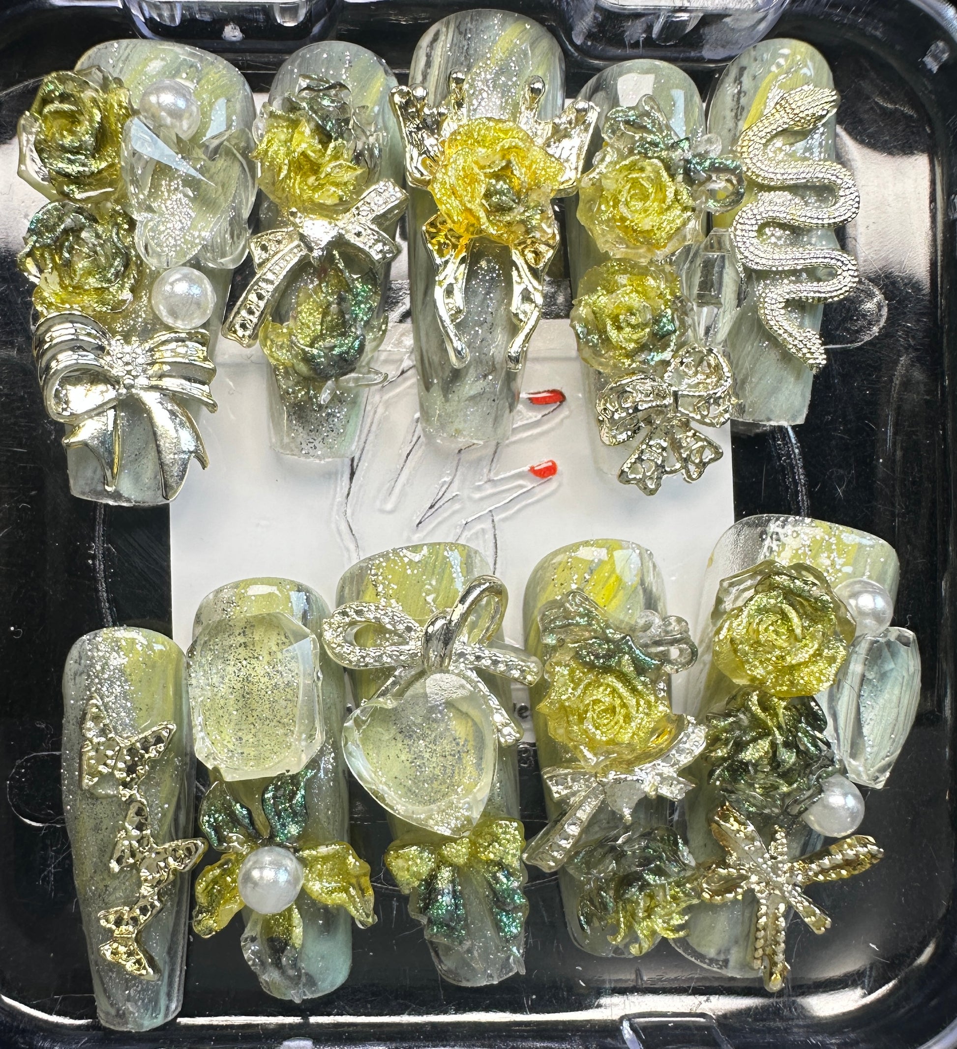 The Blossom & Glamour Collection – every set is a handcrafted floral masterpiece. Meticulous, multi-step artistry blooms on each nail, adorned with crystals and ornate details. Each design is one-of-a-kind, waiting for its only owner.