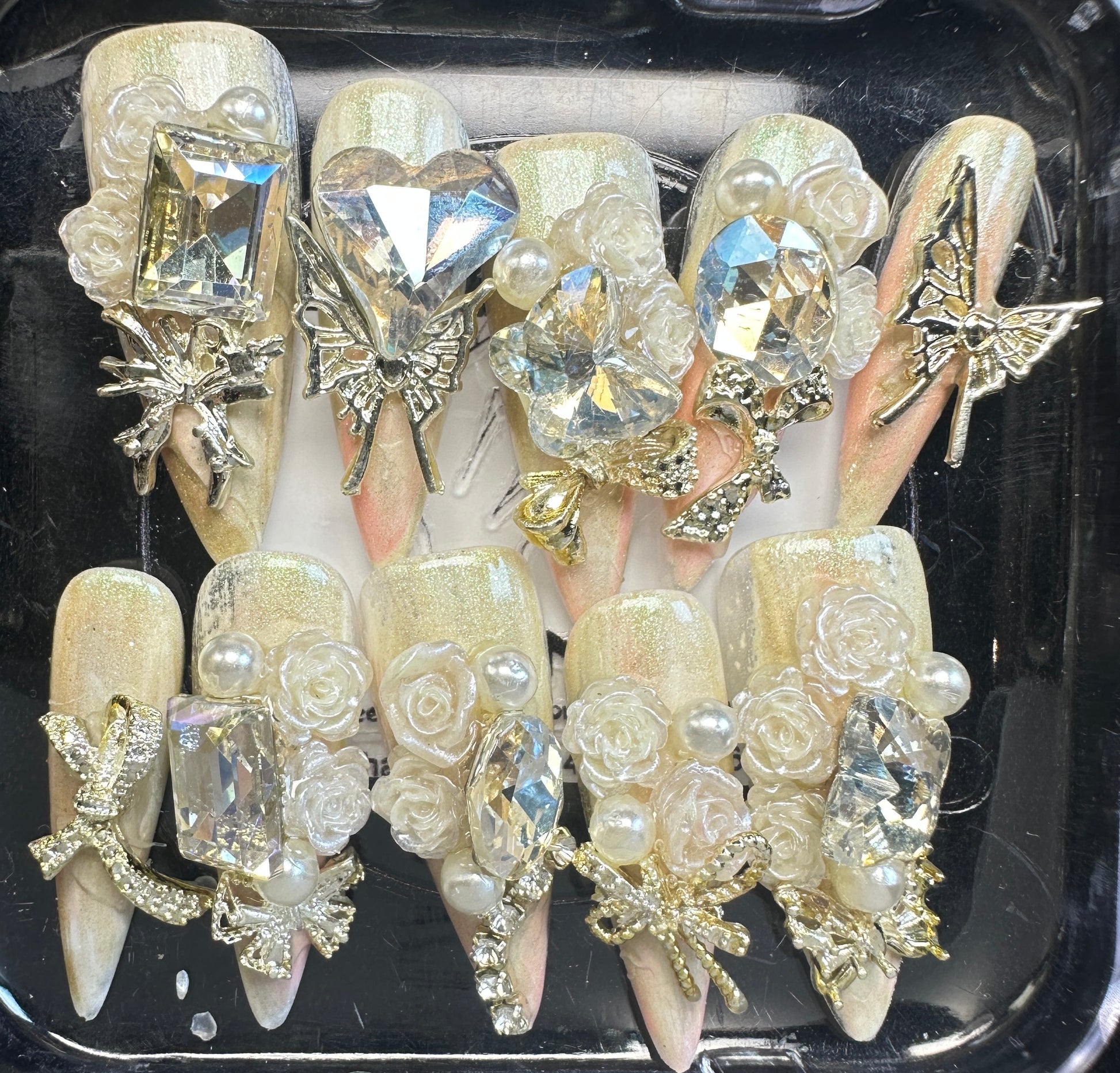 The Blossom & Glamour Collection – every set is a handcrafted floral masterpiece. Meticulous, multi-step artistry blooms on each nail, adorned with crystals and ornate details. Each design is one-of-a-kind, waiting for its only owner.