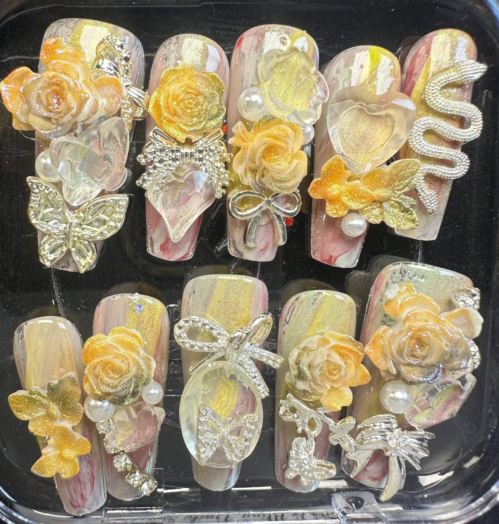 The Blossom & Glamour Collection – every set is a handcrafted floral masterpiece. Meticulous, multi-step artistry blooms on each nail, adorned with crystals and ornate details. Each design is one-of-a-kind, waiting for its only owner.