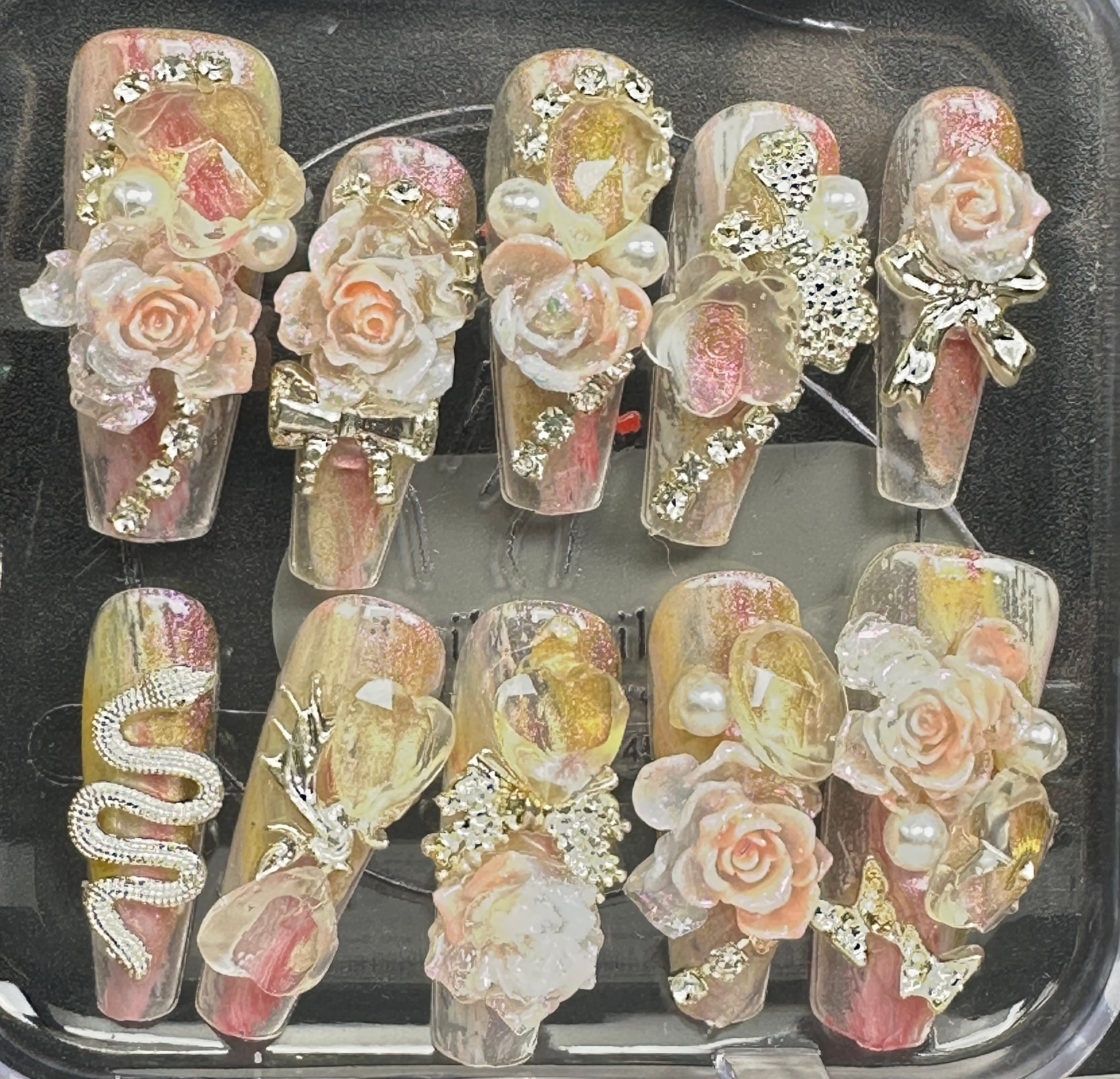 The Blossom & Glamour Collection – every set is a handcrafted floral masterpiece. Meticulous, multi-step artistry blooms on each nail, adorned with crystals and ornate details. Each design is one-of-a-kind, waiting for its only owner.