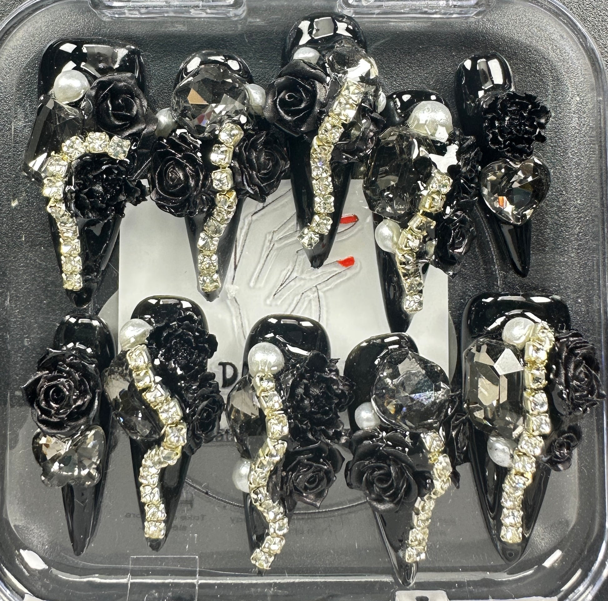 The Blossom & Glamour Collection – every set is a handcrafted floral masterpiece. Meticulous, multi-step artistry blooms on each nail, adorned with crystals and ornate details. Each design is one-of-a-kind, waiting for its only owner.