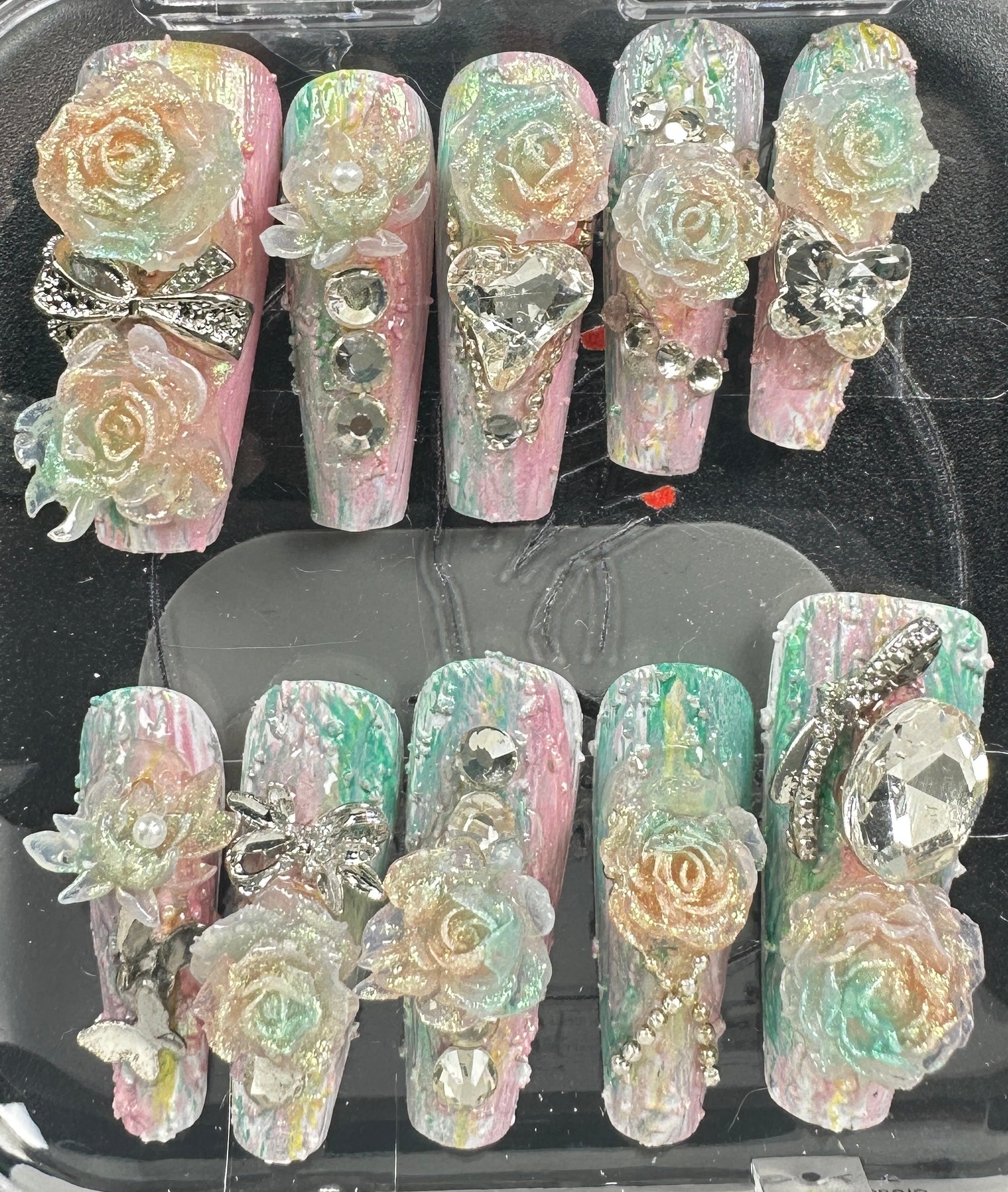 The Blossom & Glamour Collection – every set is a handcrafted floral masterpiece. Meticulous, multi-step artistry blooms on each nail, adorned with crystals and ornate details. Each design is one-of-a-kind, waiting for its only owner.