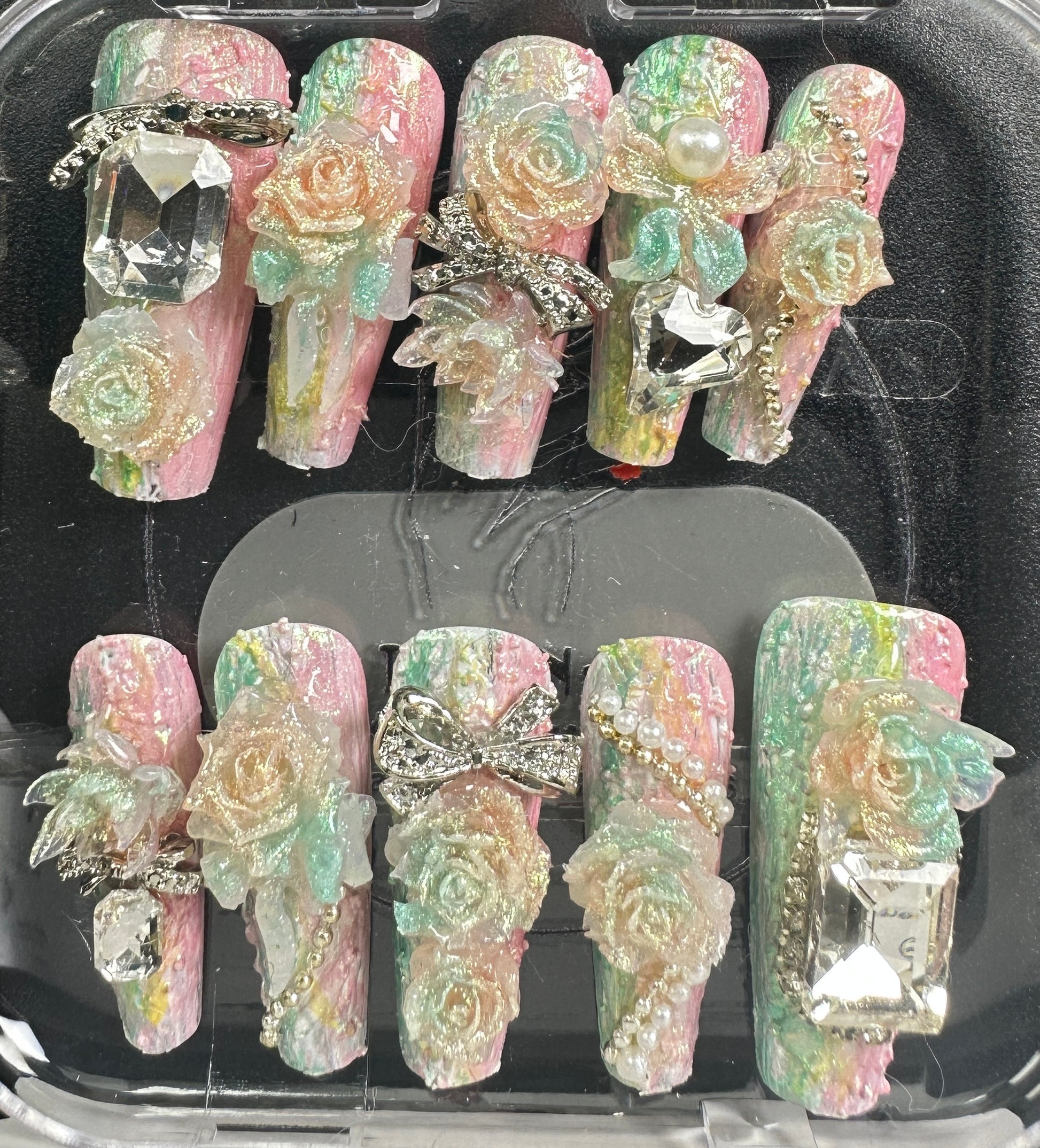 The Blossom & Glamour Collection – every set is a handcrafted floral masterpiece. Meticulous, multi-step artistry blooms on each nail, adorned with crystals and ornate details. Each design is one-of-a-kind, waiting for its only owner.