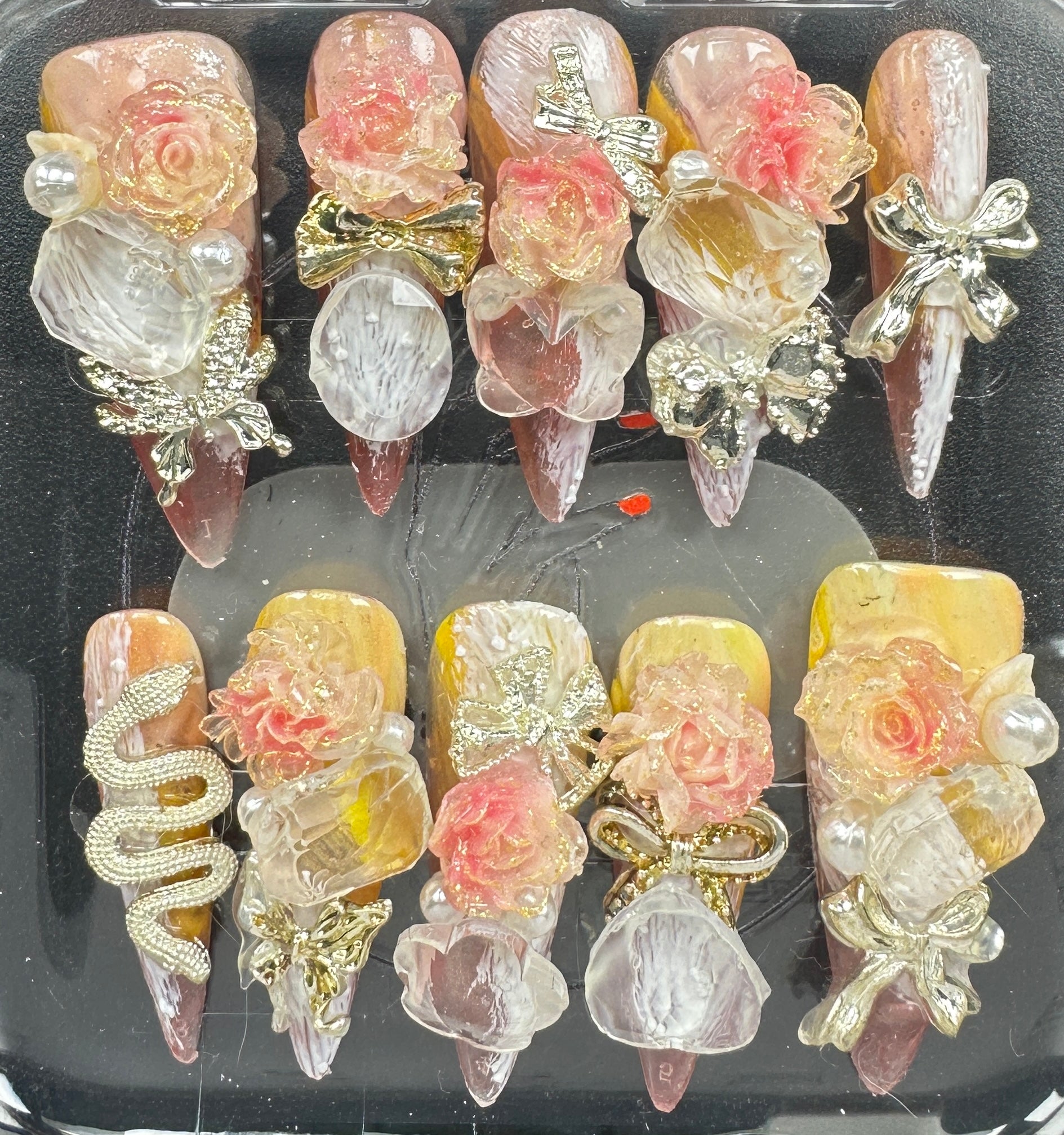 The Blossom & Glamour Collection – every set is a handcrafted floral masterpiece. Meticulous, multi-step artistry blooms on each nail, adorned with crystals and ornate details. Each design is one-of-a-kind, waiting for its only owner.
