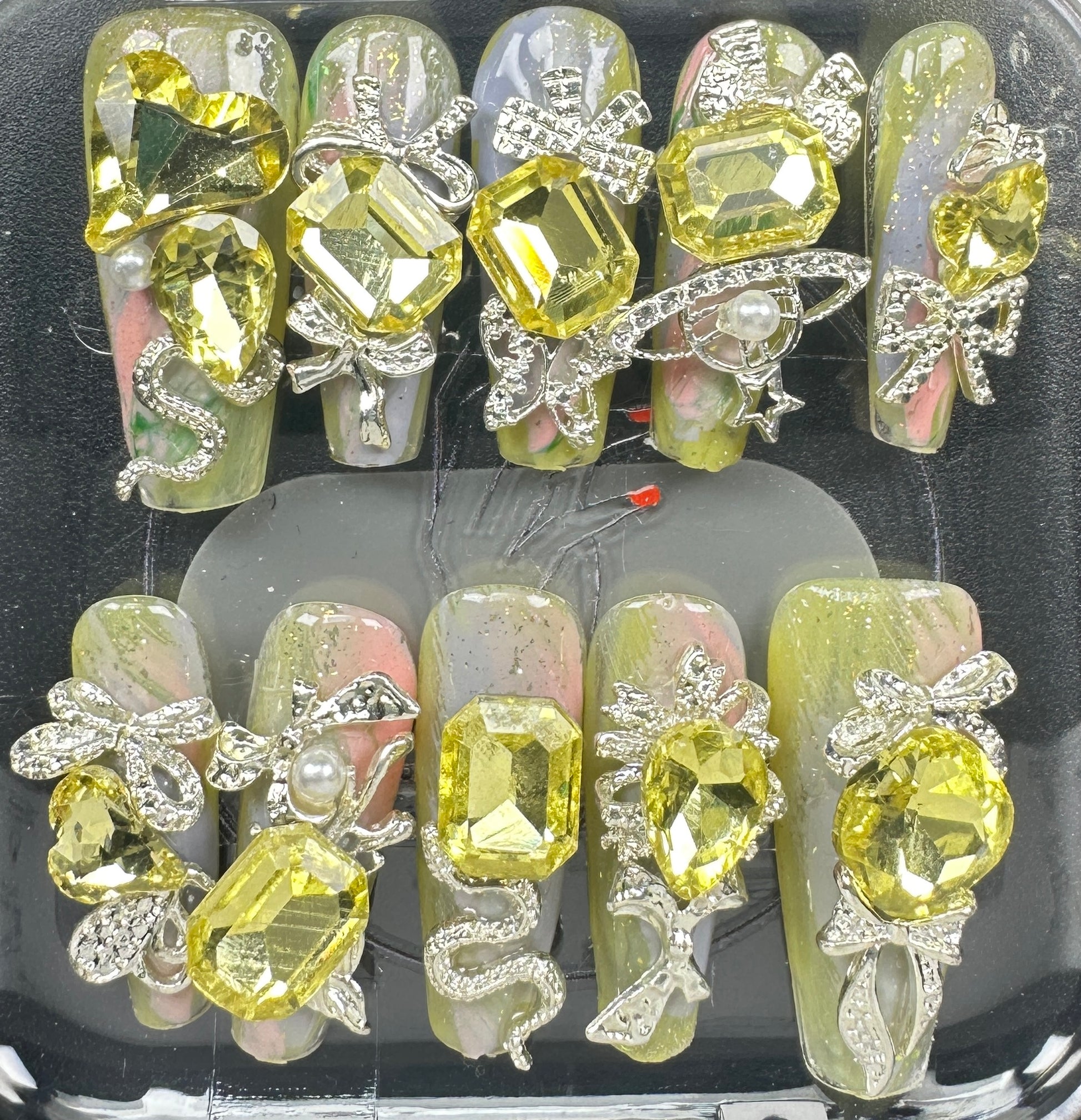 The Blossom & Glamour Collection – every set is a handcrafted floral masterpiece. Meticulous, multi-step artistry blooms on each nail, adorned with crystals and ornate details. Each design is one-of-a-kind, waiting for its only owner.