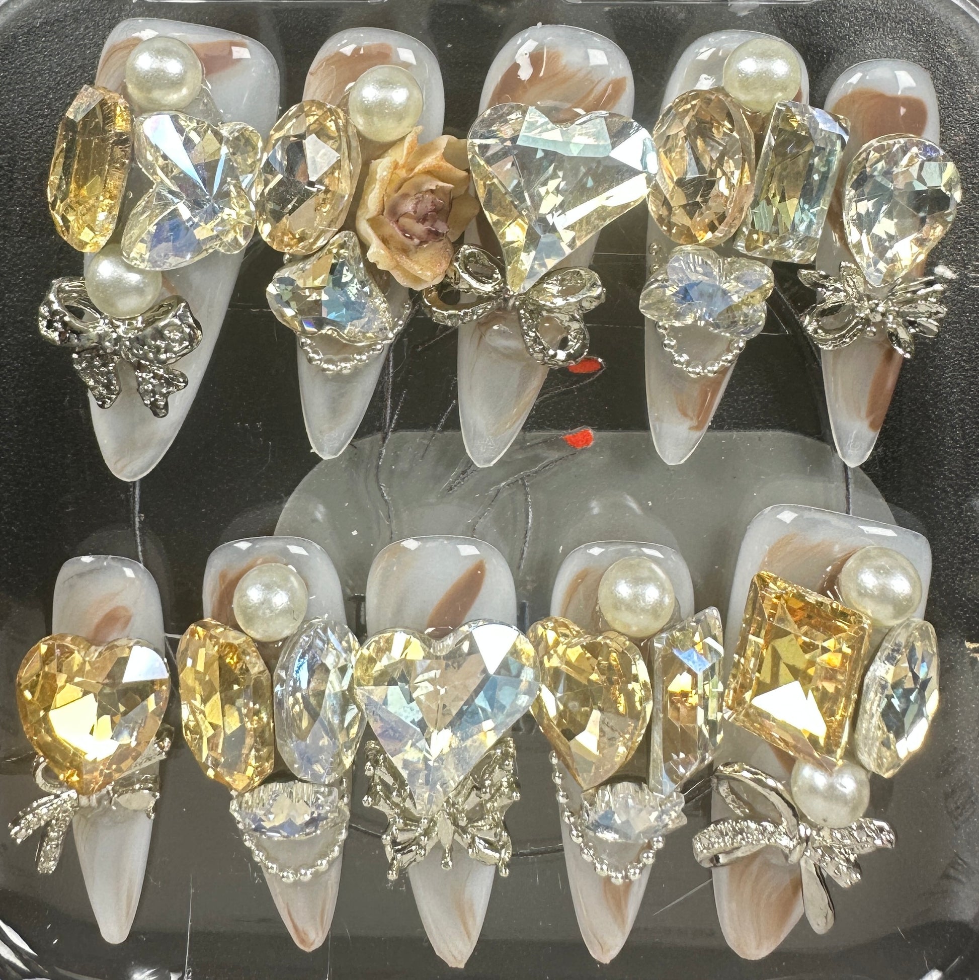 The Blossom & Glamour Collection – every set is a handcrafted floral masterpiece. Meticulous, multi-step artistry blooms on each nail, adorned with crystals and ornate details. Each design is one-of-a-kind, waiting for its only owner.