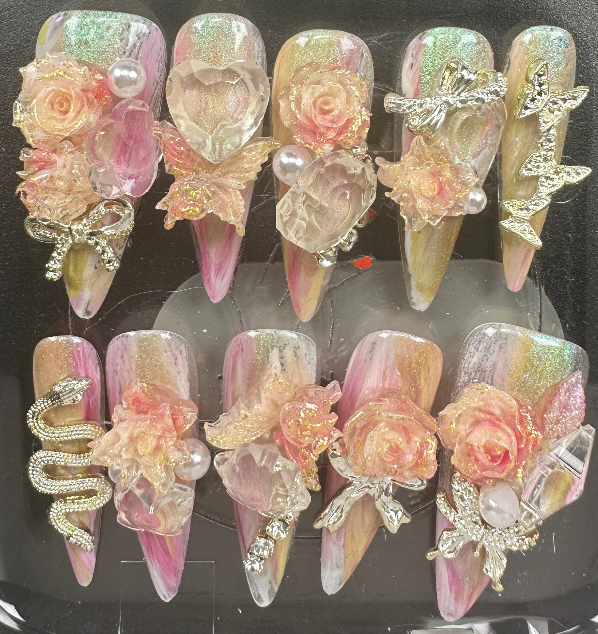 The Blossom & Glamour Collection – every set is a handcrafted floral masterpiece. Meticulous, multi-step artistry blooms on each nail, adorned with crystals and ornate details. Each design is one-of-a-kind, waiting for its only owner.