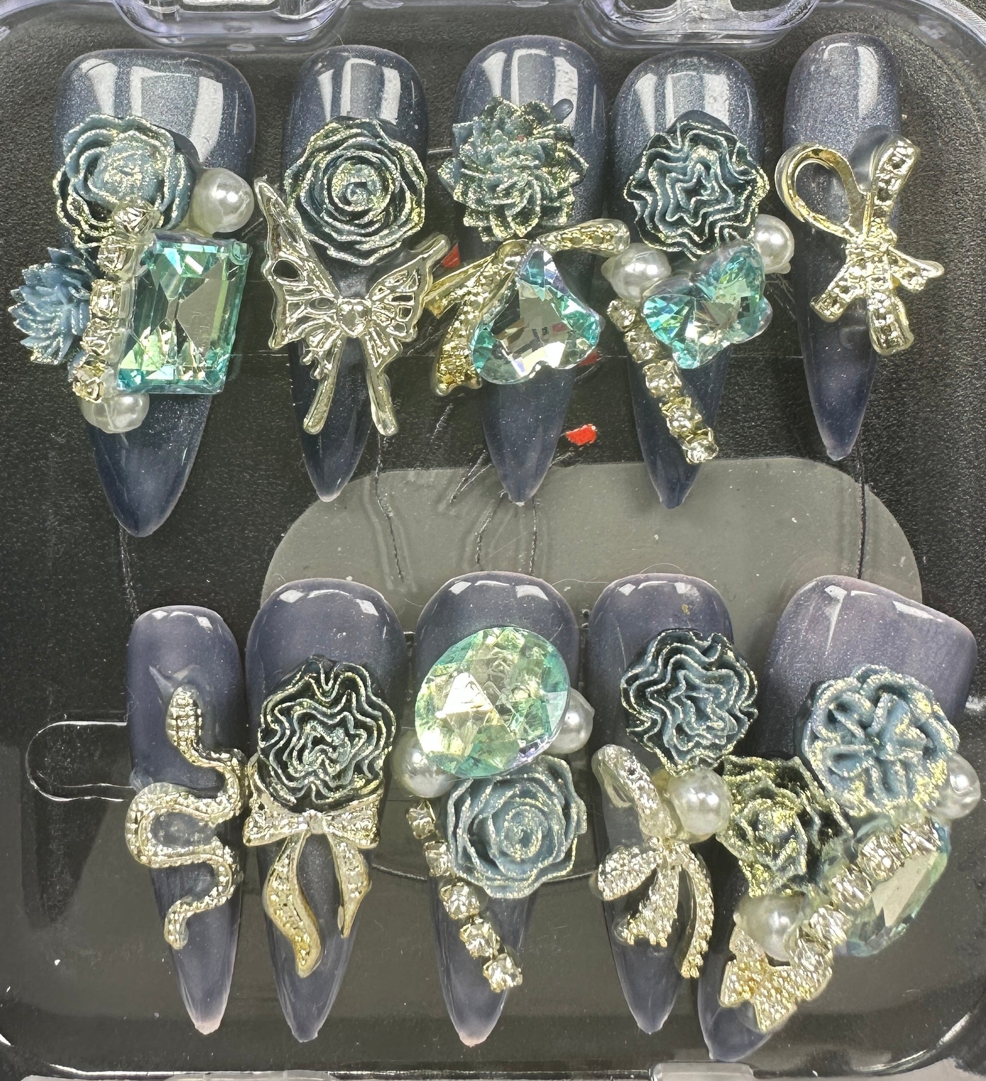 The Blossom & Glamour Collection – every set is a handcrafted floral masterpiece. Meticulous, multi-step artistry blooms on each nail, adorned with crystals and ornate details. Each design is one-of-a-kind, waiting for its only owner.