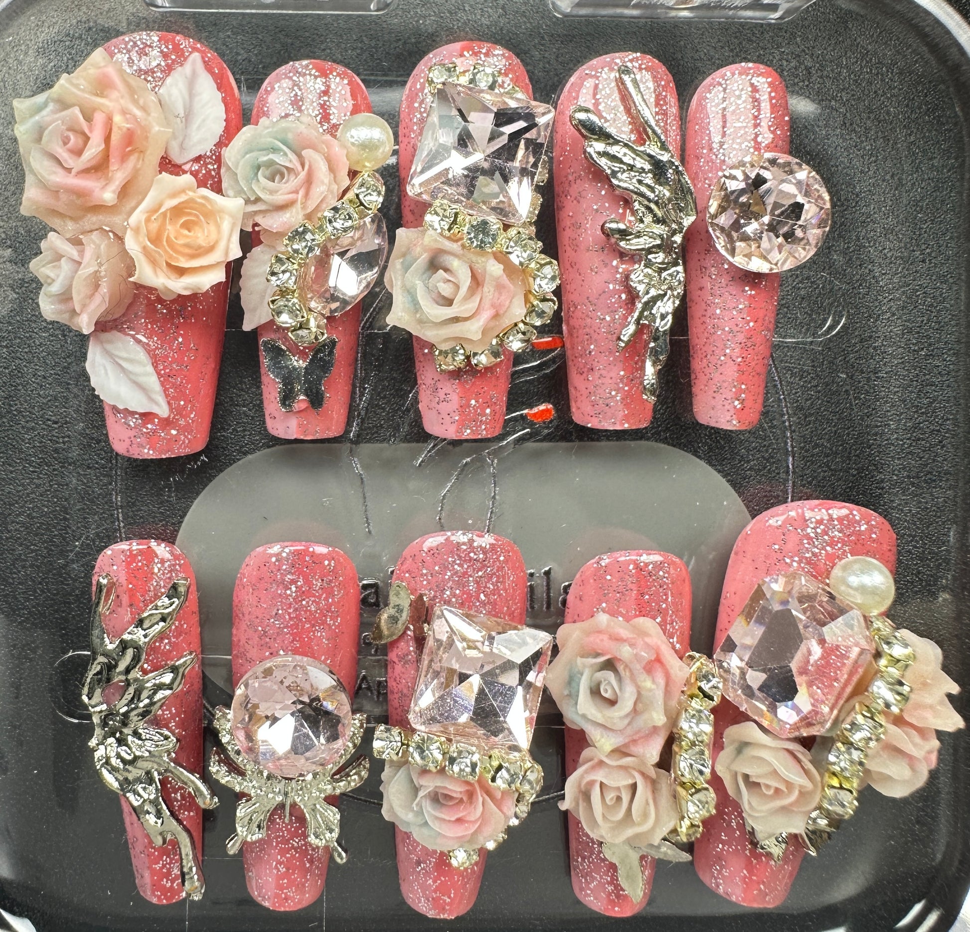 The Blossom & Glamour Collection – every set is a handcrafted floral masterpiece. Meticulous, multi-step artistry blooms on each nail, adorned with crystals and ornate details. Each design is one-of-a-kind, waiting for its only owner.