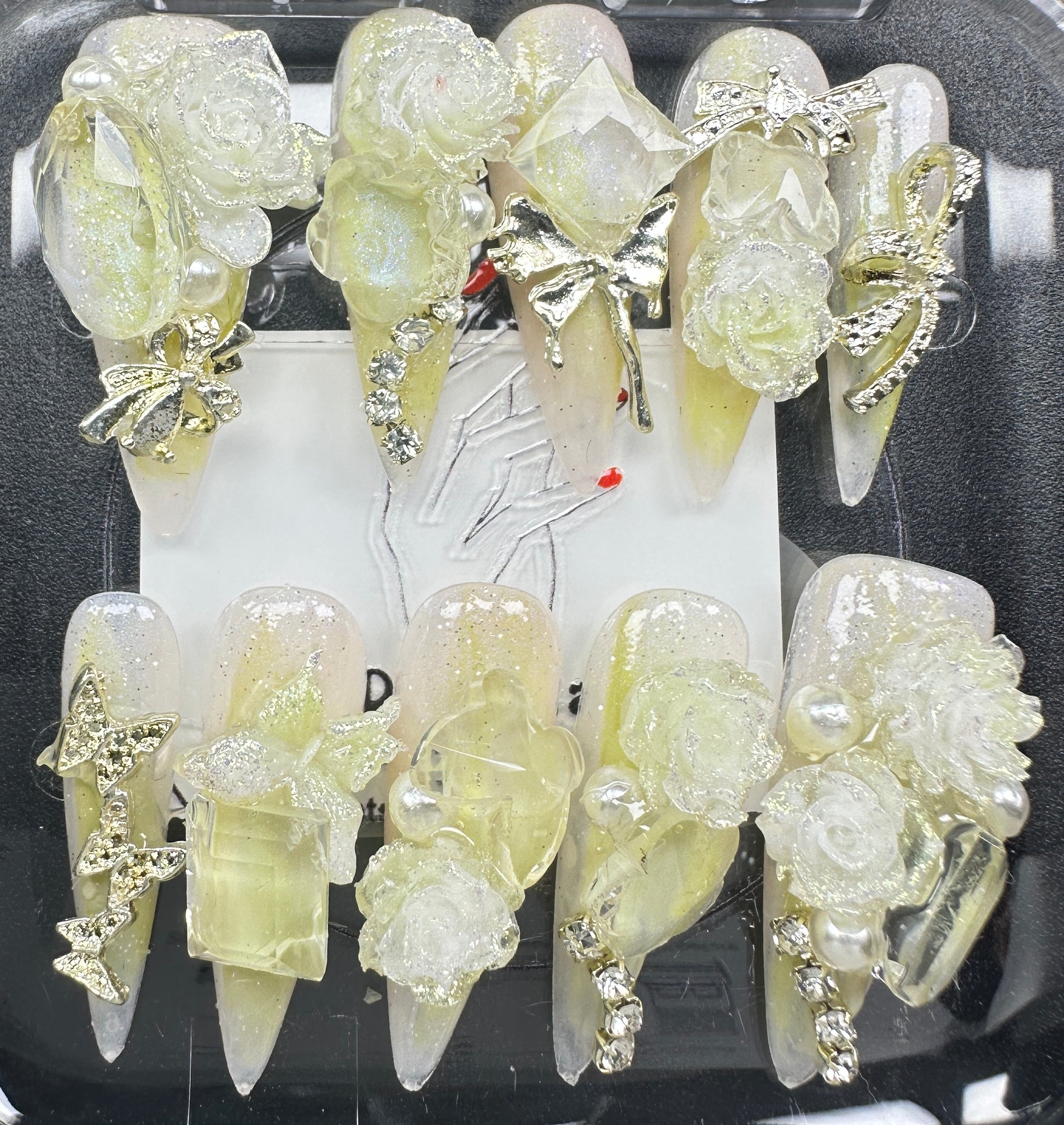The Blossom & Glamour Collection – every set is a handcrafted floral masterpiece. Meticulous, multi-step artistry blooms on each nail, adorned with crystals and ornate details. Each design is one-of-a-kind, waiting for its only owner.