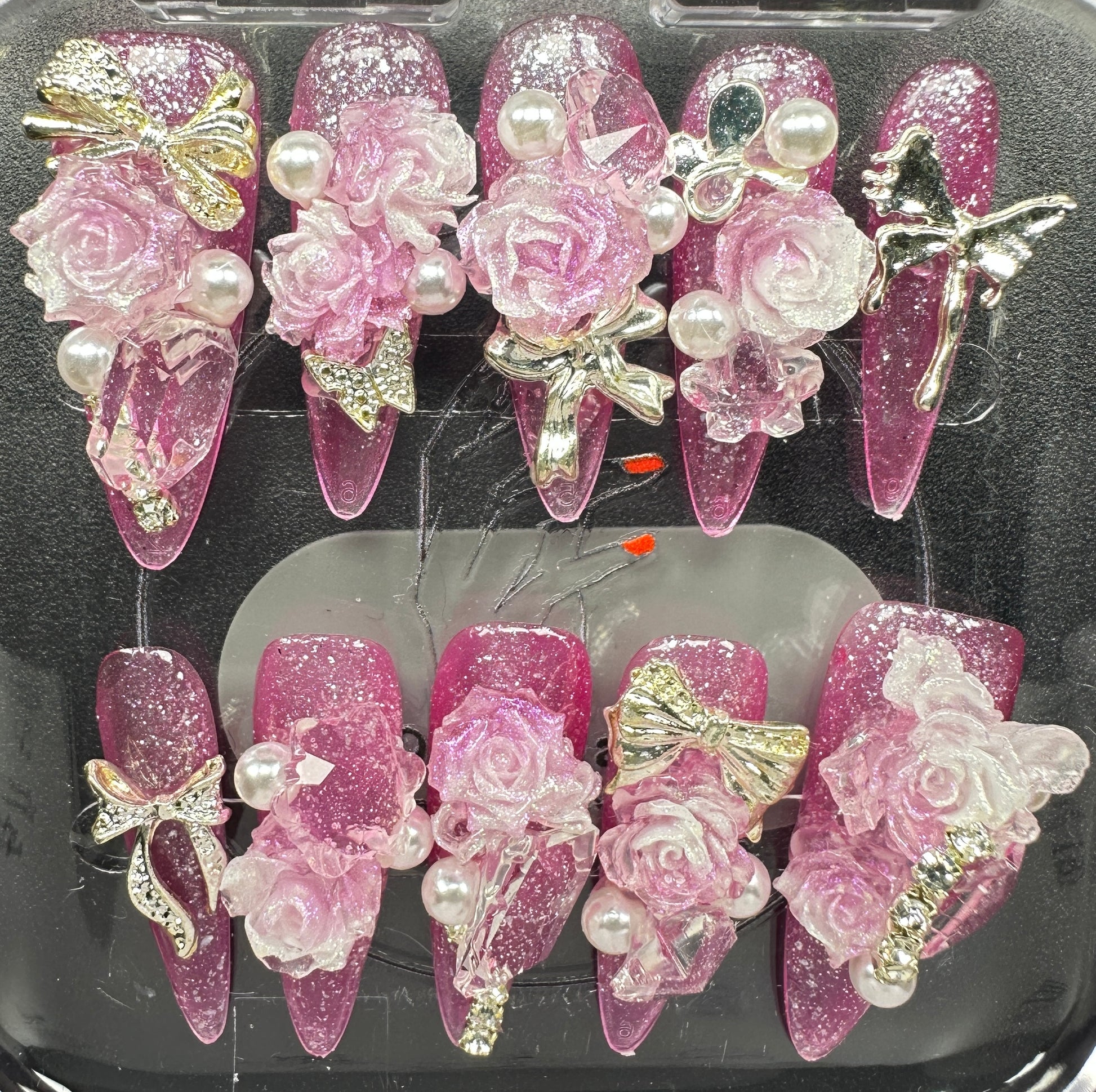 The Blossom & Glamour Collection – every set is a handcrafted floral masterpiece. Meticulous, multi-step artistry blooms on each nail, adorned with crystals and ornate details. Each design is one-of-a-kind, waiting for its only owner.