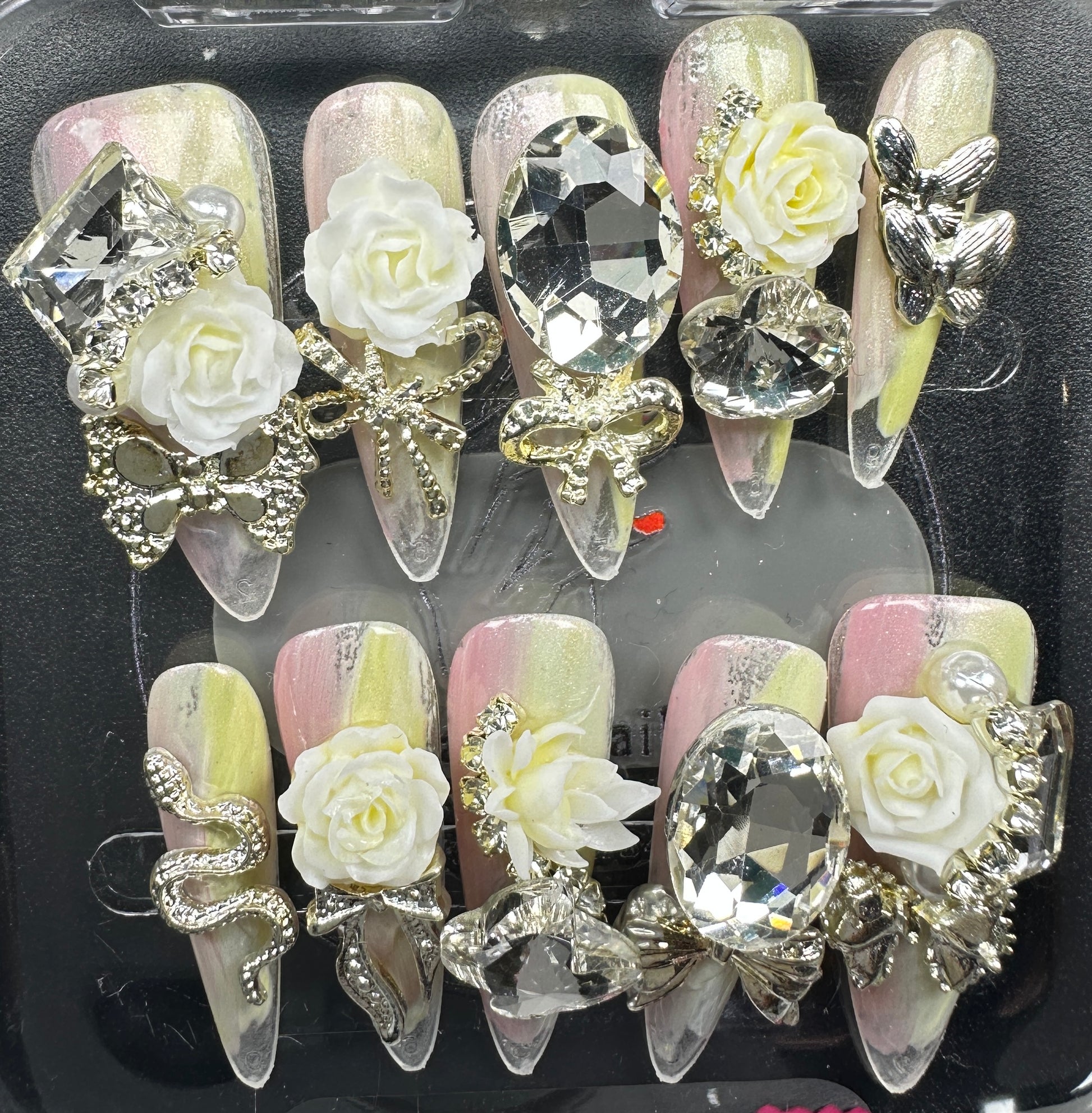 The Blossom & Glamour Collection – every set is a handcrafted floral masterpiece. Meticulous, multi-step artistry blooms on each nail, adorned with crystals and ornate details. Each design is one-of-a-kind, waiting for its only owner.