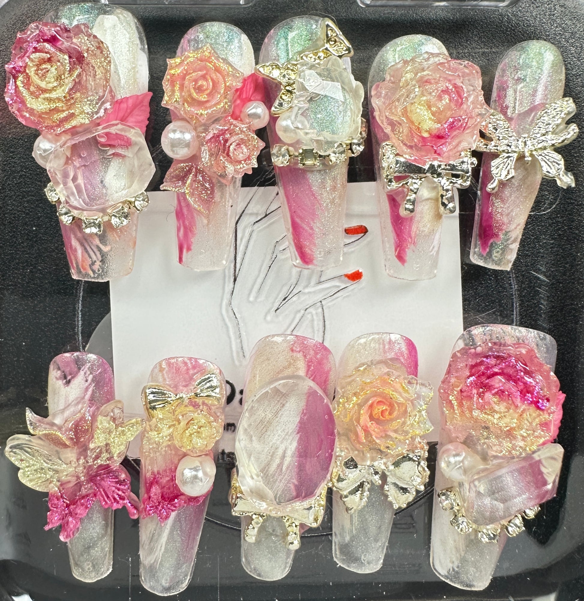 The Blossom & Glamour Collection – every set is a handcrafted floral masterpiece. Meticulous, multi-step artistry blooms on each nail, adorned with crystals and ornate details. Each design is one-of-a-kind, waiting for its only owner.