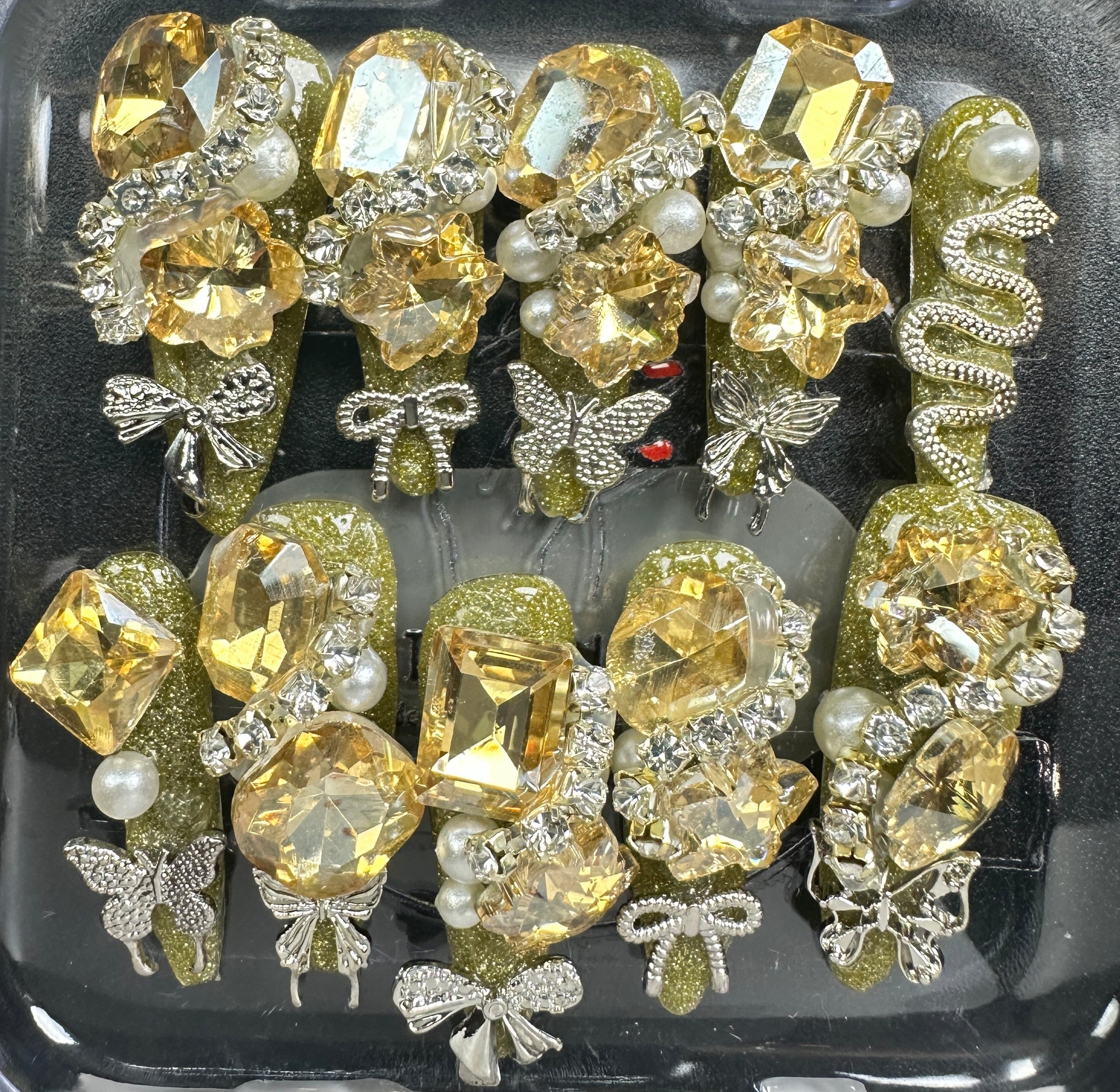 The Blossom & Glamour Collection – every set is a handcrafted floral masterpiece. Meticulous, multi-step artistry blooms on each nail, adorned with crystals and ornate details. Each design is one-of-a-kind, waiting for its only owner.