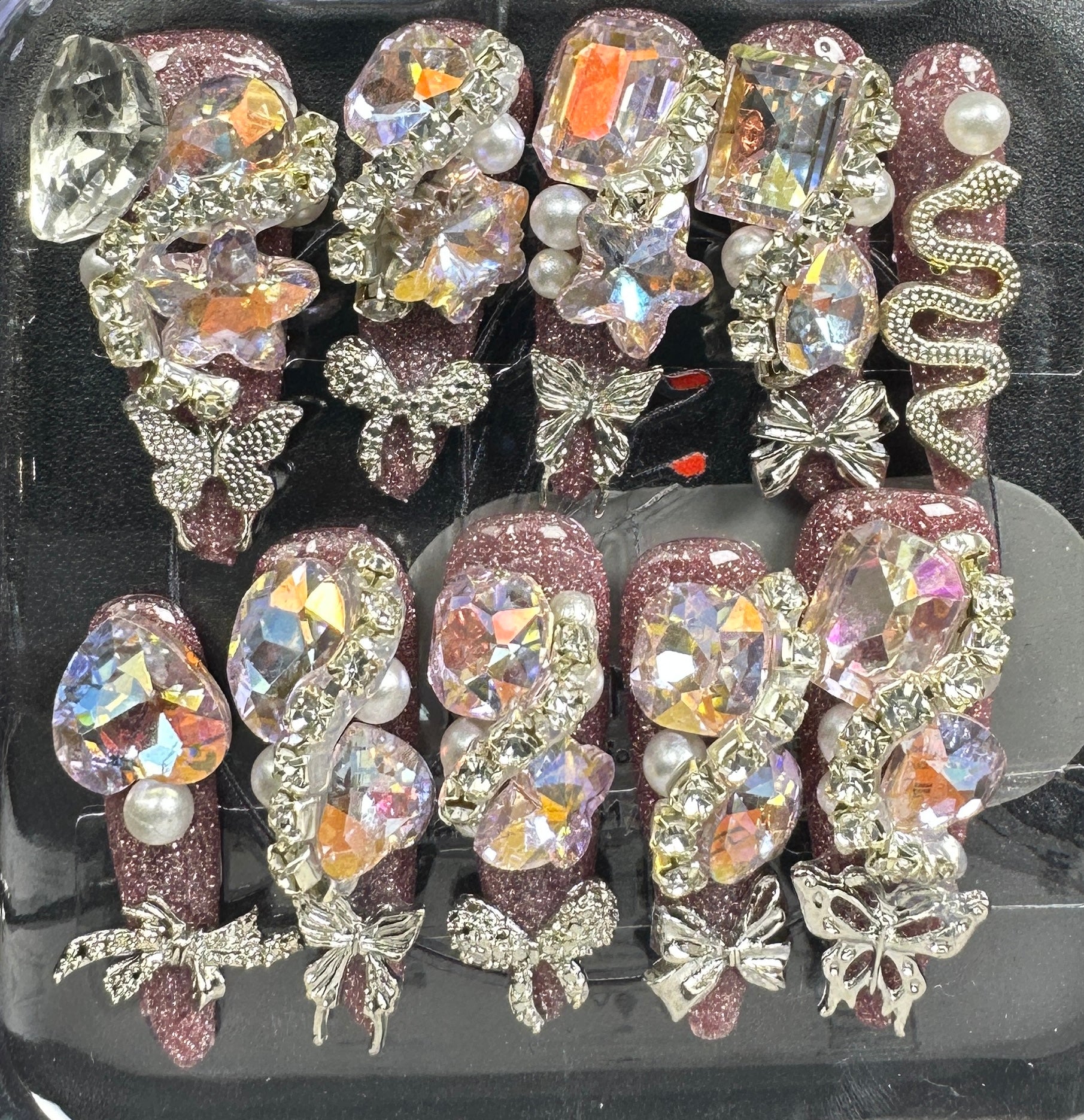 The Blossom & Glamour Collection – every set is a handcrafted floral masterpiece. Meticulous, multi-step artistry blooms on each nail, adorned with crystals and ornate details. Each design is one-of-a-kind, waiting for its only owner.