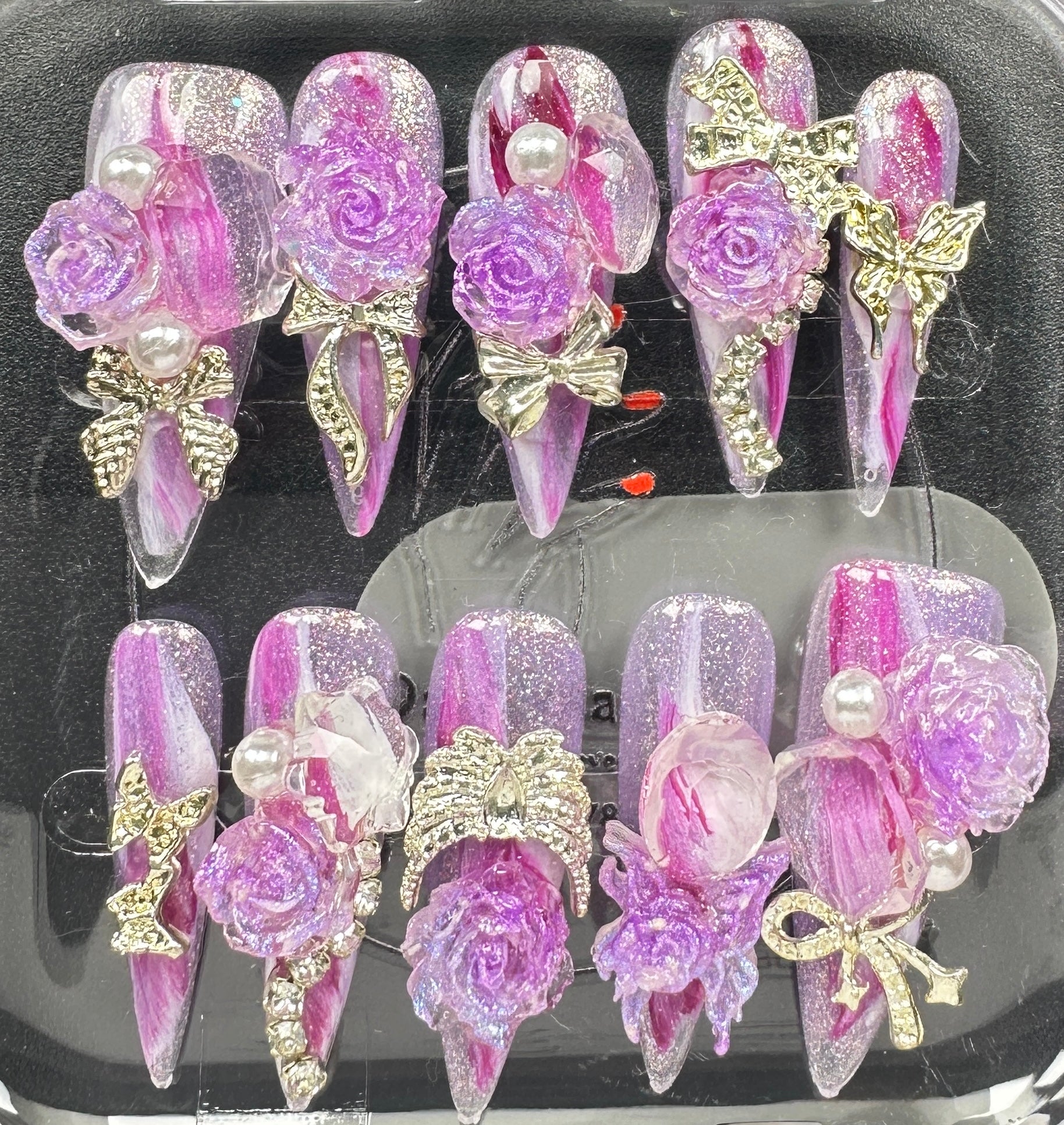 The Blossom & Glamour Collection – every set is a handcrafted floral masterpiece. Meticulous, multi-step artistry blooms on each nail, adorned with crystals and ornate details. Each design is one-of-a-kind, waiting for its only owner.