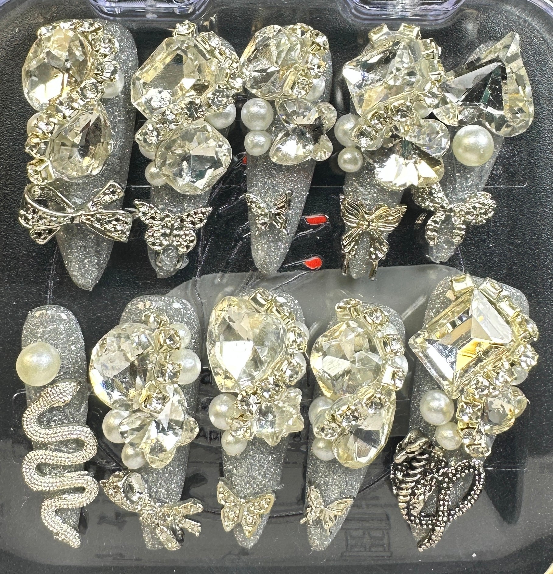 The Blossom & Glamour Collection – every set is a handcrafted floral masterpiece. Meticulous, multi-step artistry blooms on each nail, adorned with crystals and ornate details. Each design is one-of-a-kind, waiting for its only owner.
