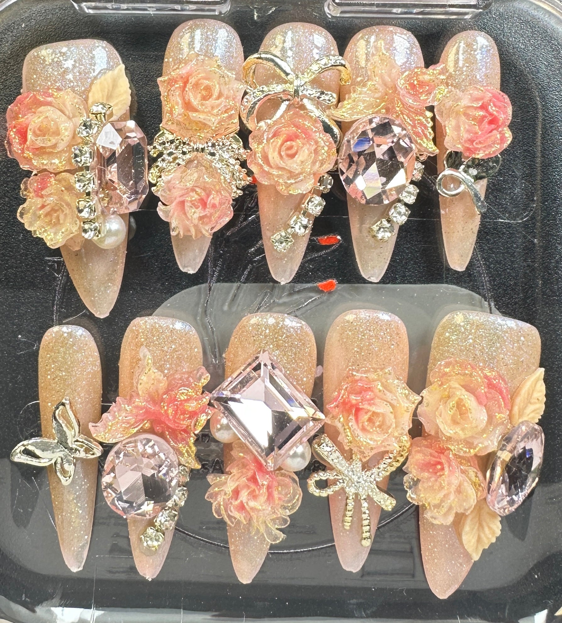 The Blossom & Glamour Collection – every set is a handcrafted floral masterpiece. Meticulous, multi-step artistry blooms on each nail, adorned with crystals and ornate details. Each design is one-of-a-kind, waiting for its only owner.
