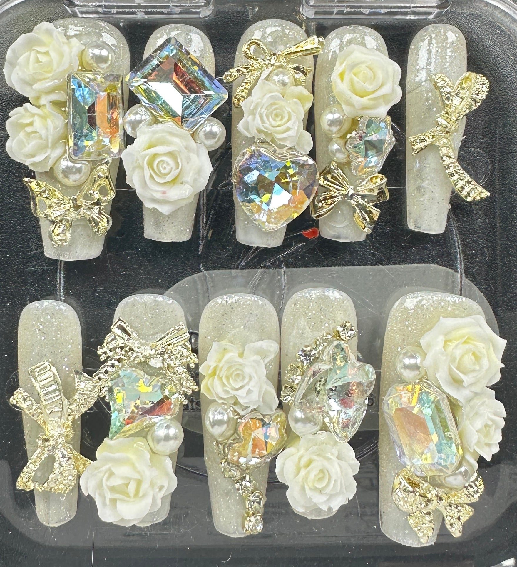 The Blossom & Glamour Collection – every set is a handcrafted floral masterpiece. Meticulous, multi-step artistry blooms on each nail, adorned with crystals and ornate details. Each design is one-of-a-kind, waiting for its only owner.
