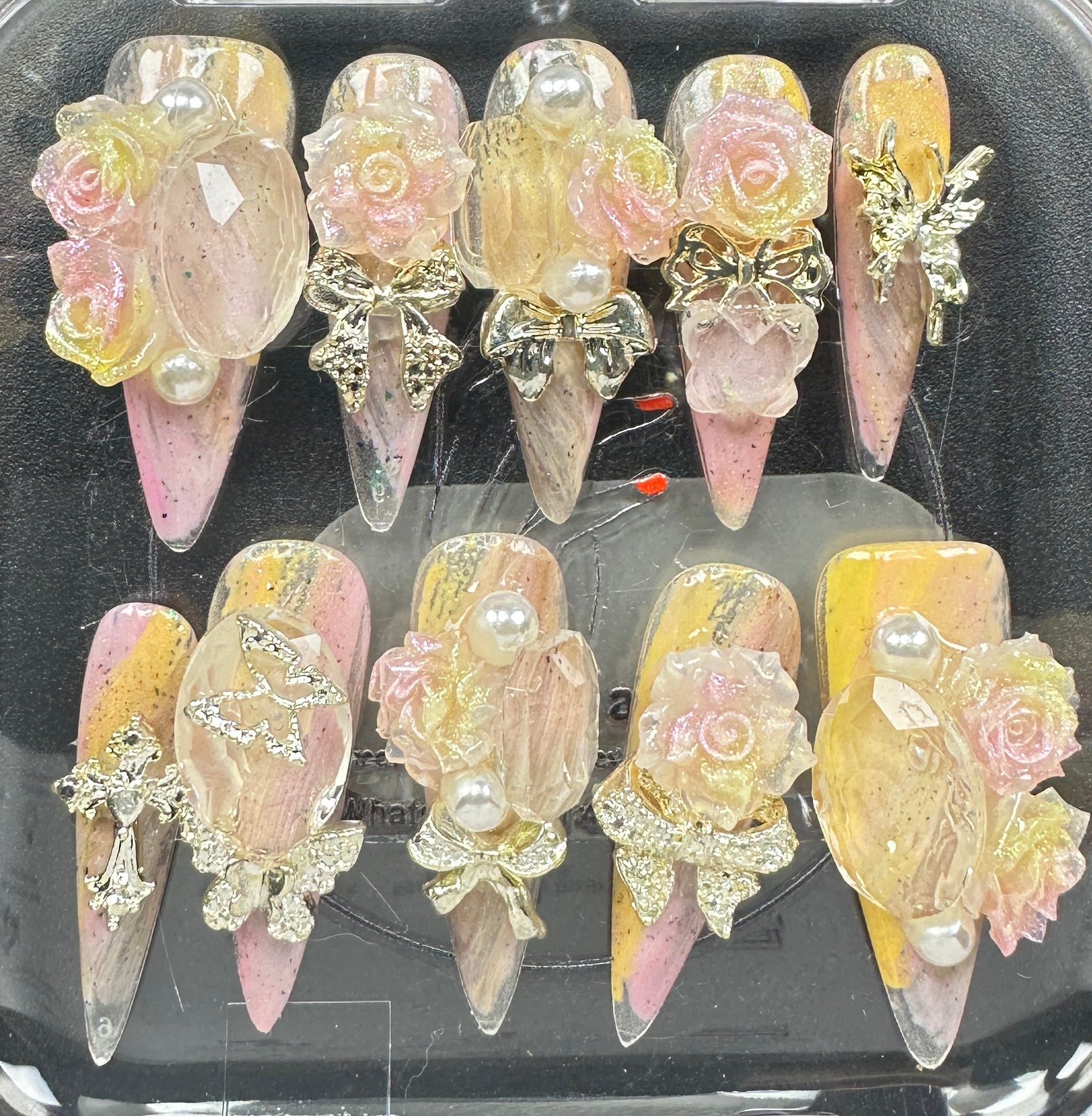 The Blossom & Glamour Collection – every set is a handcrafted floral masterpiece. Meticulous, multi-step artistry blooms on each nail, adorned with crystals and ornate details. Each design is one-of-a-kind, waiting for its only owner.