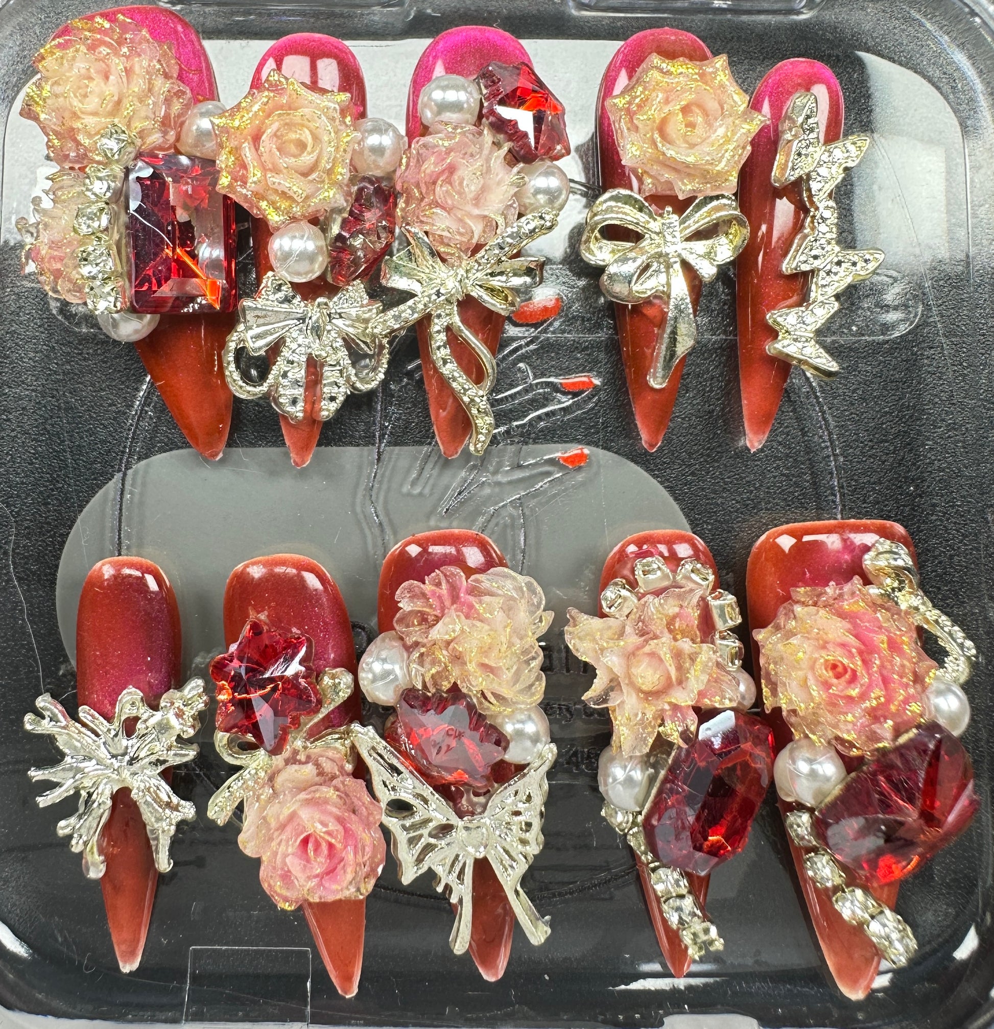 The Blossom & Glamour Collection – every set is a handcrafted floral masterpiece. Meticulous, multi-step artistry blooms on each nail, adorned with crystals and ornate details. Each design is one-of-a-kind, waiting for its only owner.